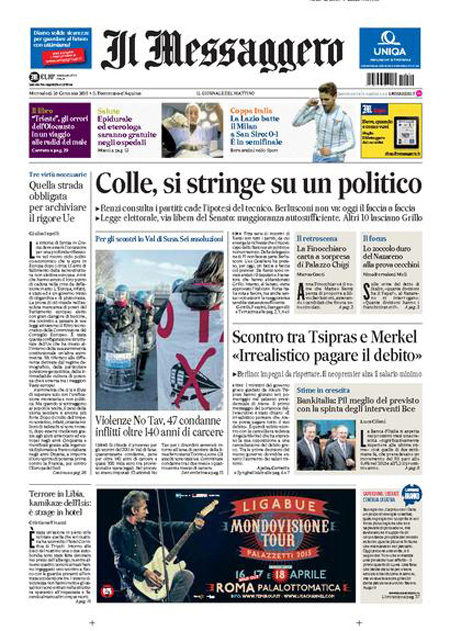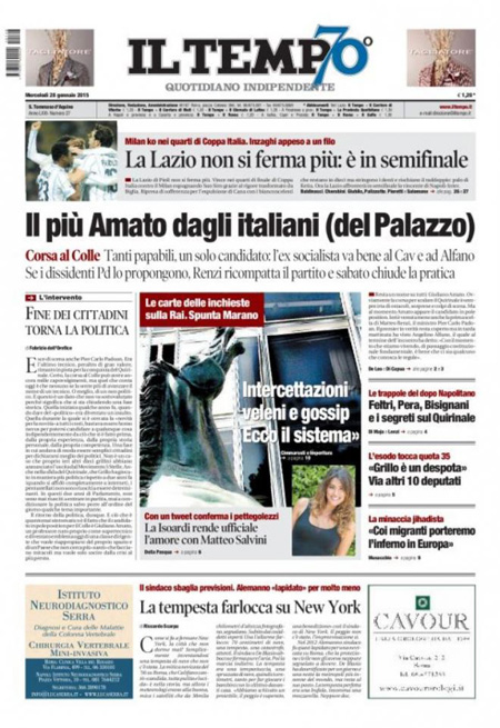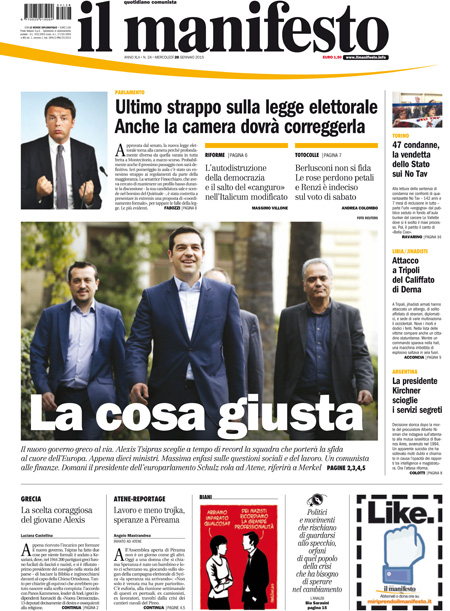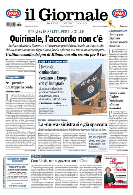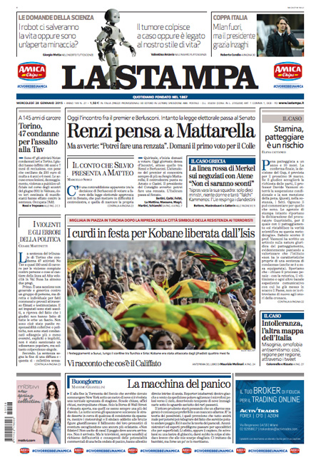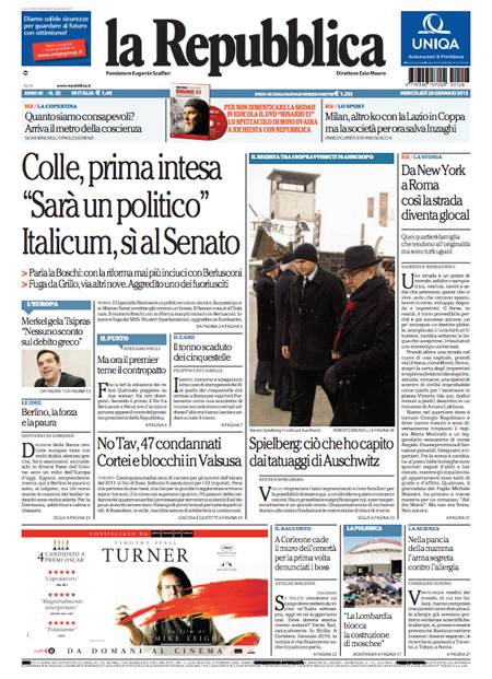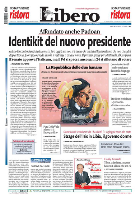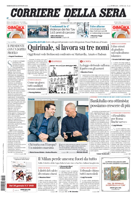 ROMA – Le prime pagine dei giornali di mercoledì 28 gennaio 2015. La Stampa: “Renzi pensa a Mattarella”. Il Corriere della Sera: “Quirinale, si lavora su tre nomi”. La Repubblica: “Colle, prima intesa: sarà un politico”. Il Giornale: “Strada in salita per il Colle. Quirinale, l’accordo non c’è”. Il Manifesto: “La cosa giusta”. Il Fatto Quotidiano: “Trattativa Stato-Mediaset. L’ultimo ricatto di B.”. Libero: “Affondato anche Padoan. Identikit del nuovo presidente”.