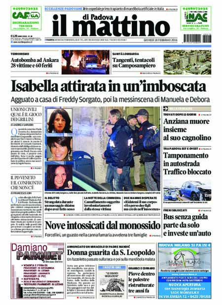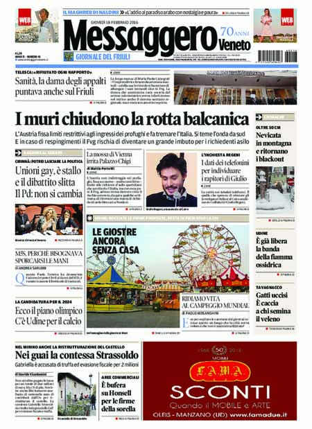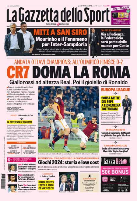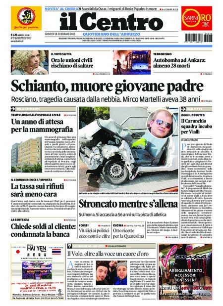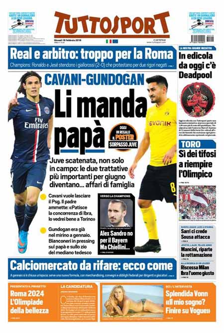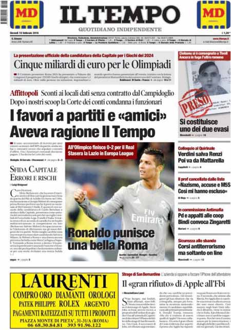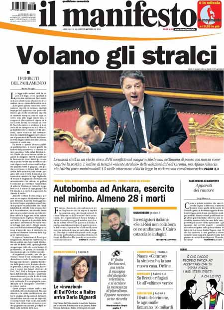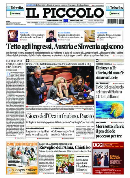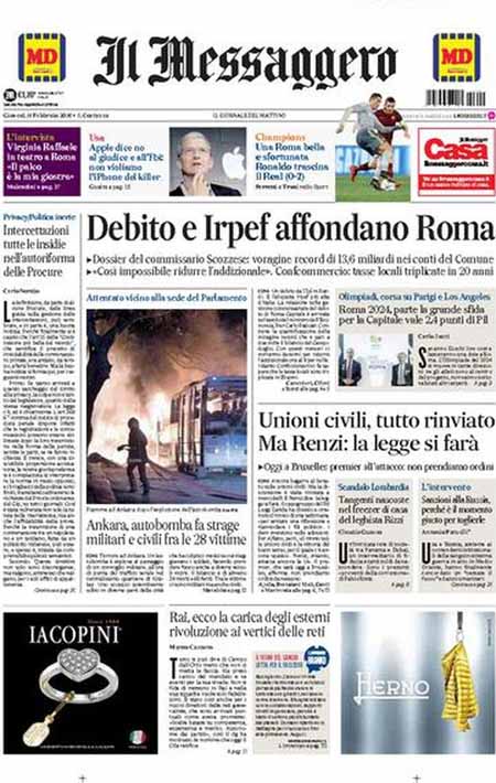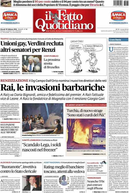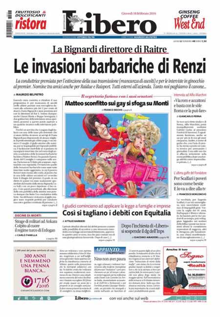 La prima pagina di Libero: “Le invasioni barbariche di Renzi. La Bignardi direttore di Rai Tre. La conduttrice premiata per l’estinzione della sua trasmissione (mancanza di ascolti) e per le interviste in ginocchio. Nomine tra amici anche per Rai Due e Rai Sport. Tutti esterni all’azienda. Tanto noi paghiamo il canone”. La prima pagina del Tempo: “Sconti ai locali dati senza contratto al Campidoglio. Dopo i nostri scoop la Corte dei conti condanna i funzionari”. La prima pagina del Fatto Quotidiano: “Rai, le invasioni barbariche”. La prima pagina del Messaggero: “Debito e Irpef affondano Roma. Dossier del commissario Scozzese: voragine record di 13,6 miliardi nei conti del Comune”. Rai, Unioni civili: queste le prime pagine dei giornali di giovedรฌ 18 febbraio.