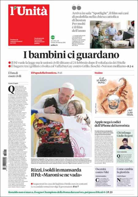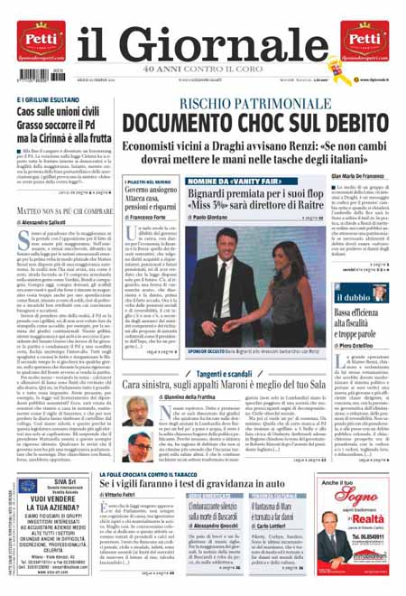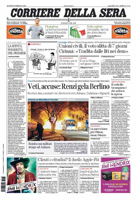 ROMA – Rai, Unioni civili: queste le prime pagine dei giornali di giovedรฌ 18 febbraio. La prima pagina del Corriere della Sera: “Veti, accuse: Renzi gela Berlino”. La prima pagina della Repubblica: “Unioni civili, legge nel caos. La mossa di M5S spiazza il Pd. Cirinnร : ho sbagliato a fidarmi. Renzi: avanti, no ai ricatti grillini”. La prima pagina del Giornale: “Rischio patrimoniale. Documento choc sul debito. Economisti vicini a Draghi avvisano Renzi. se non cambi dovrai mettere le mani nelle tasche degli italiani”.