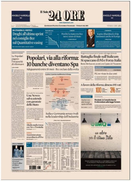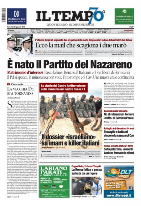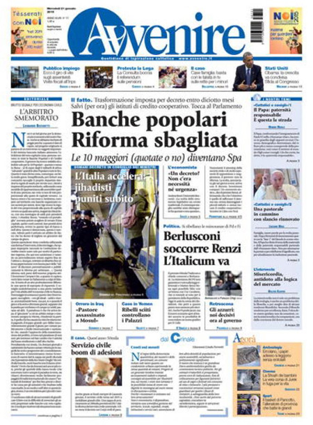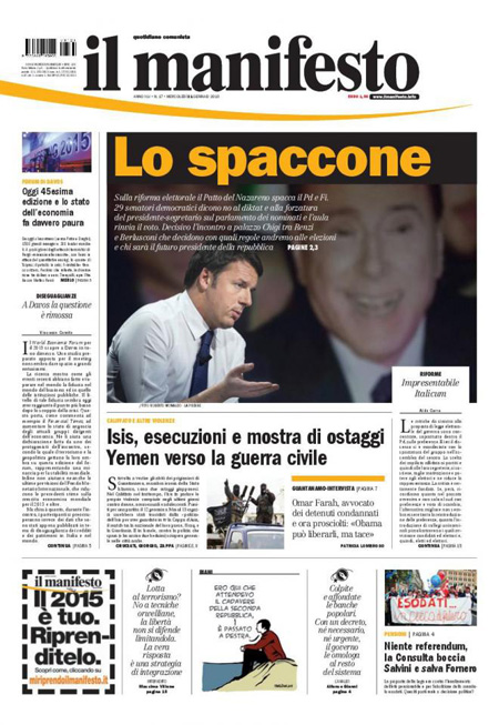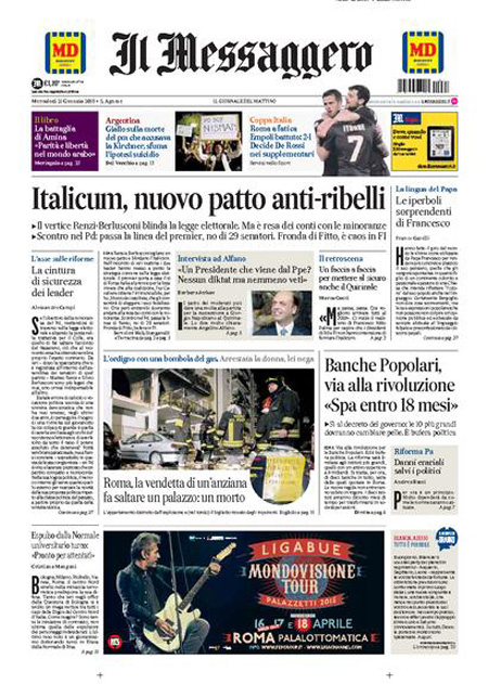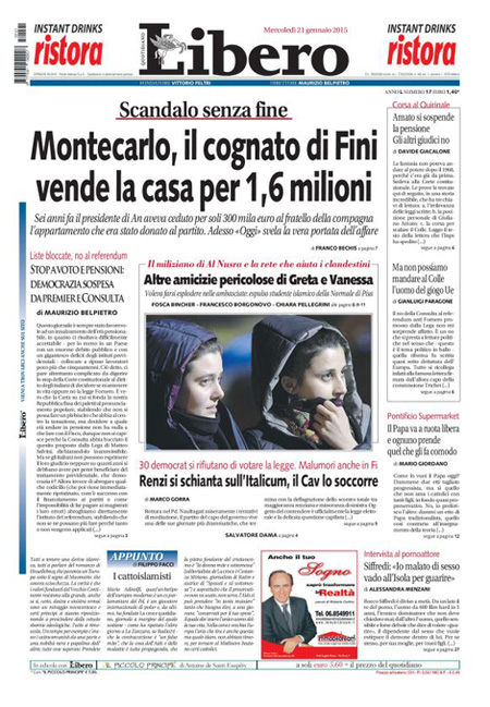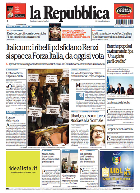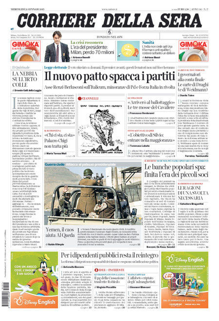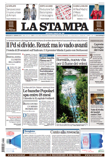 ROMA – Le prime pagine dei giornali di mercoledì 21 gennaio. La Stampa: “Il Pd si divide. Renzi: ma io vado avanti”. Il Corriere della Sera: “Il nuovo patto spacca i partiti”. La Repubblica: “Italicum: i ribelli Pd sfidano Renzi. Si spacca Forza Italia, da oggi si vota”. Il Sole 24 Ore: “Popolari, al via la riforma”. Il Messaggero: “Italicum, nuovo patto anti-ribelli”. Il Giornale: “A un passo dalla crisi: la maggioranza non c’è più”. Il Fatto Quotidiano: “Voto di scambio”. Libero: “Scandalo senza fine: Montecarlo, il cognato di Fini vende la casa per 1,6 milioni”.