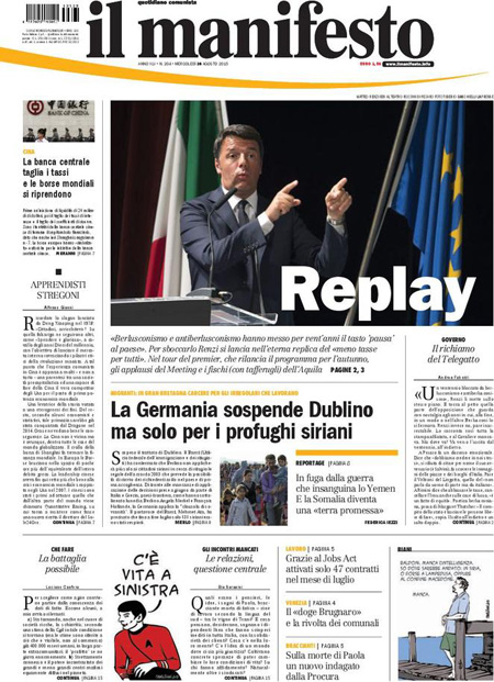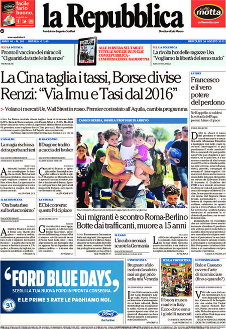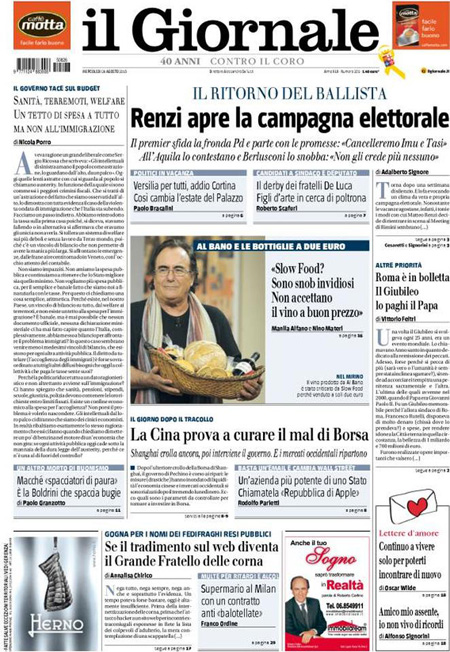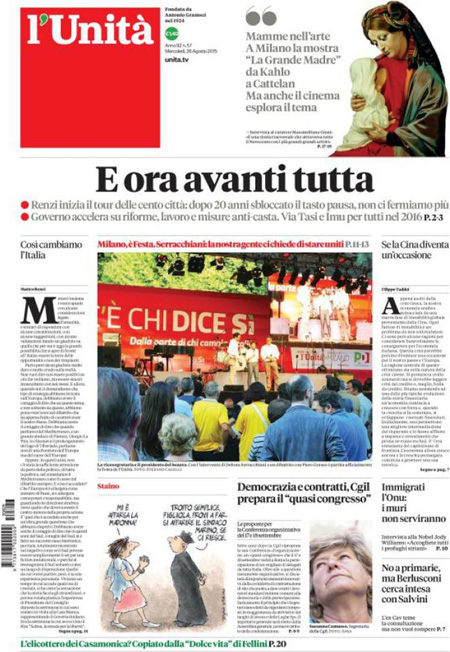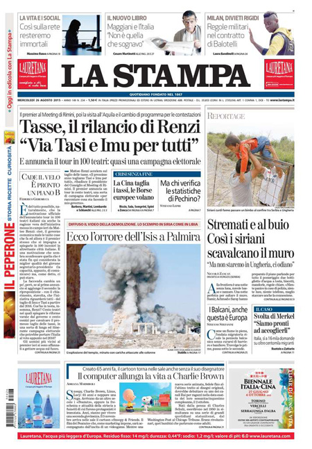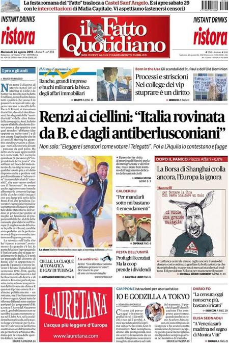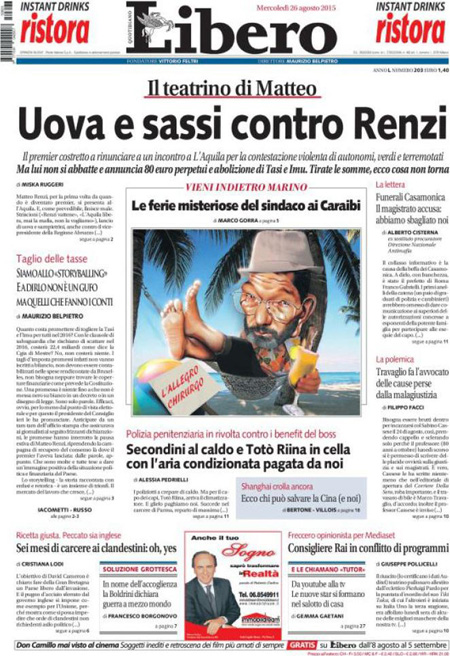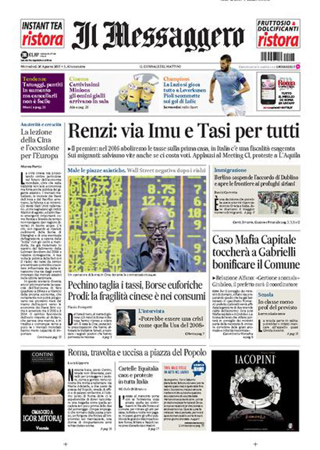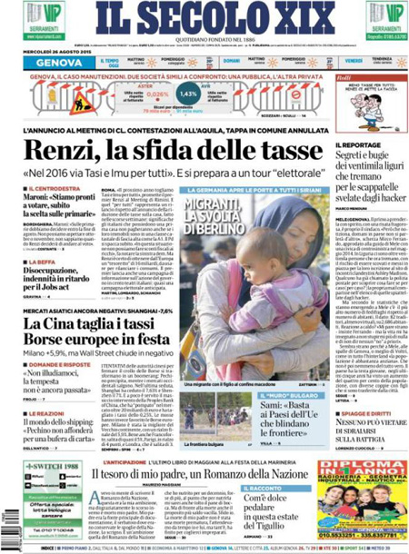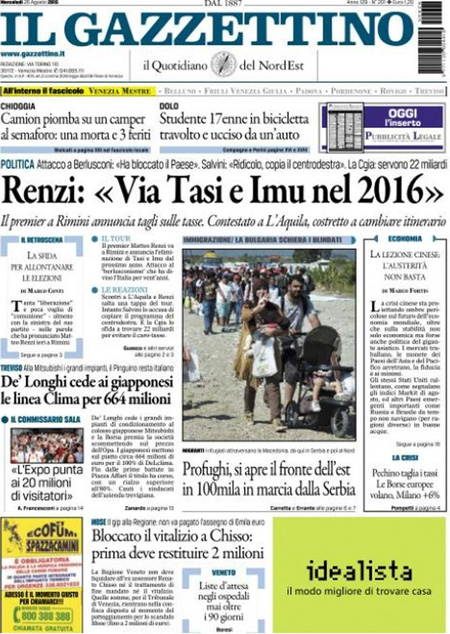 ROMA – I giornali di oggi, 26 agosto, aprono riportando le dichiarazioni di Matteo Renzi fatte durante il suo discorso al Meeting di Comunione e Liberazione a Rimini: in particolare la cosa che ha attirato l’attenzione dei giornali è la promessa di Renzi di abolire la Tasi e l’Imu a partire dal 2016, promessa che per la verità era già stata fatta lo scorso luglio.