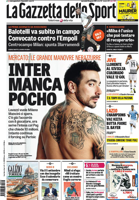 Sui giornali sportivi si parla del possibile arrivo di Lavezzi all’Inter, quello di Witsel alla Juventus e la presentazione di Balotelli al Milan.