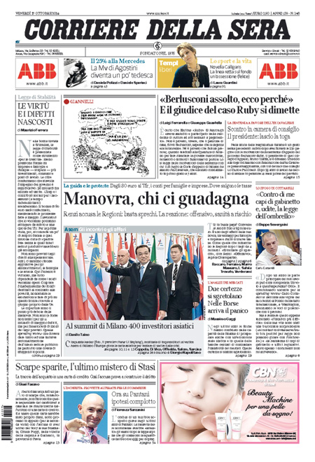 “Nella bozza inviata a Bruxelles, la legge di Stabilità è presentata come strumento «per la crescita»: meno pressione fiscale su imprese e famiglie e dunque — si spera — più investimenti, consumi e posti di lavoro. Le cifre confermano che stavolta l’impegno del governo è significativo: 36 miliardi fra entrate ed uscite. L’Irap e i contributi sociali per i neo-assunti (a tempo indeterminato) scenderanno. Il bonus di 80 euro sarà confermato, mantenendo le promesse fatte a maggio. I lavoratori che lo vorranno potranno attingere da subito a una quota del Tfr. Per la prima volta, poi, si concede un po’ di respiro fiscale a quel milione circa di «partite Iva» senza le quali interi settori produttivi sarebbero già scomparsi.