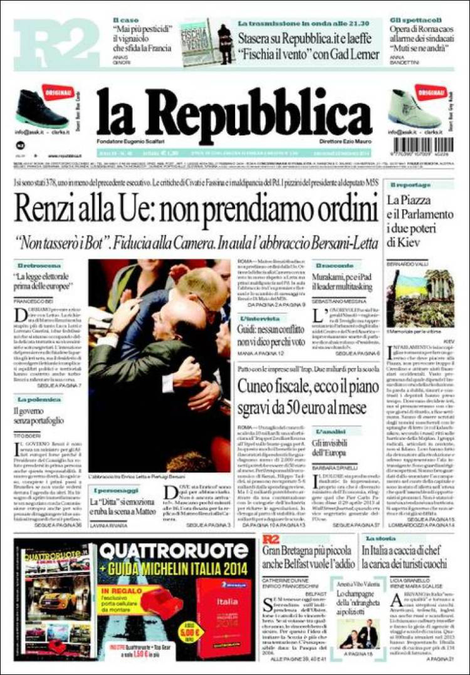 La prima pagina de La Repubblica: “Renzi alla Ue: non prendiamo ordini”.