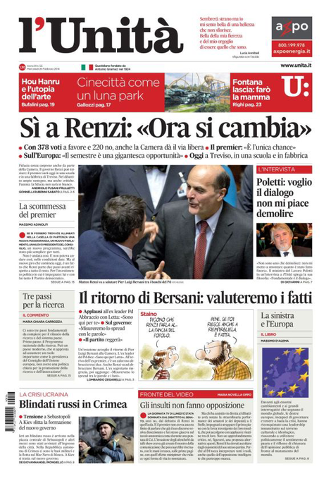La tentazione di porsi come capo di un governo contro il cosiddetto ยซPalazzoยป rimane vistosa. Ma si avverte, da parte di Matteo Renzi, anche la presa dโatto di dipendere dai voti del Parlamento e dunque di non potersi fare troppi nemici; e di essere circondato da un corposo scetticismo sulla possibilitร di durare per lโintera legislatura. Dallโequilibrio che riuscirร a trovare tra la sua doppia identitร si capiranno anche il futuro del governo e della legislatura. Lโex segretario del Pd, Pierluigi Bersani, tornato per votare la fiducia dopo unโoperazione, ha sintetizzato il problema con una metafora. ยซDa domaniยป, ha detto, ยซgli italiani vorranno misurare lo spread tra parole e fattiยป.