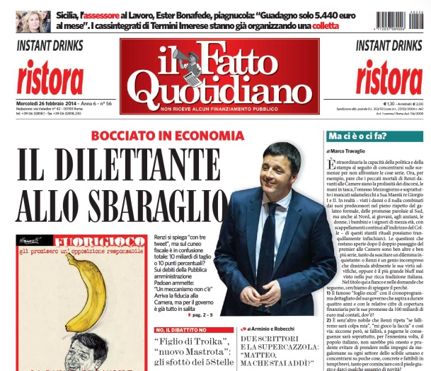 La prima pagina del Fatto Quotidiano: “Il dilettante allo sbaraglio”.
