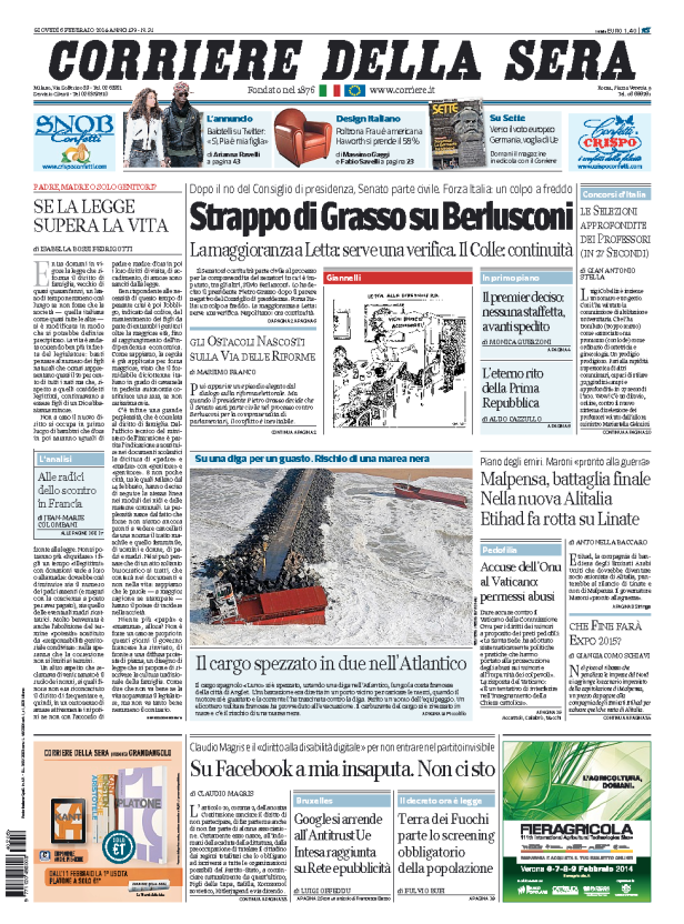 Il Corriere della Sera: “La stretta di Renzi su Letta”. Una staffetta verso il nulla. Editoriale di Antonio Polito: