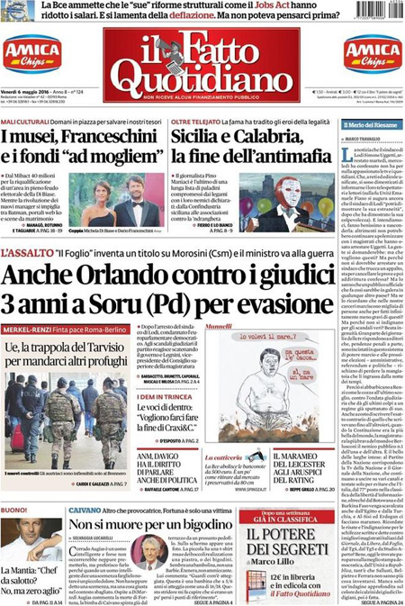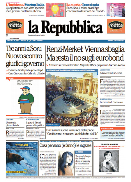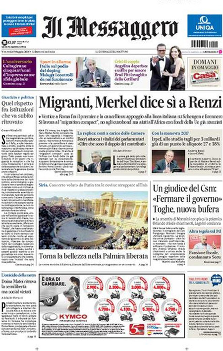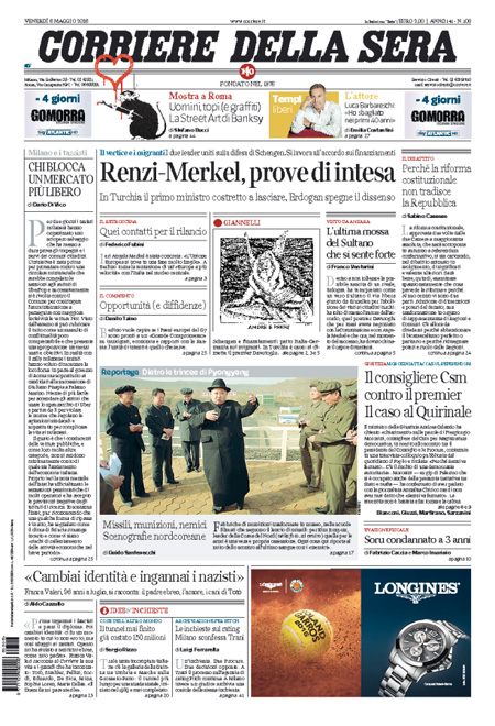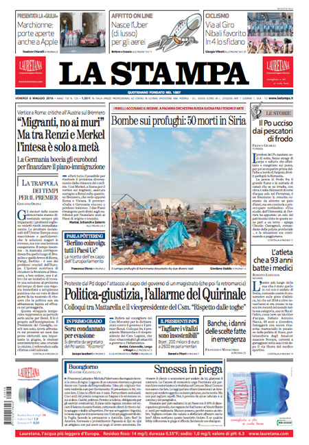 ROMA – Queste le prime pagine dei giornali di venerdรฌ 6 maggio. La prima pagina del Corriere della Sera: “Bombe sui profughi: 50 morti in Siria”. La prima pagina del Corriere della Sera: “Renzi-Merkel: prove di intesa. In Turchia il primo ministro costretto a lasciare, Erdogan spegne il dissenso”. La prima pagina de La Repubblica: “Renzi-Merkel: Vienna sbaglia. Ma resta il no sugli eurobond. Al lavoro sul piano alternativo”.