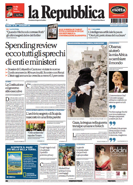 La prima pagina di Repubblica: “Spending review, ecco tutti gli sprechi di enti e ministeri”.