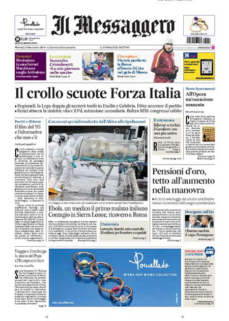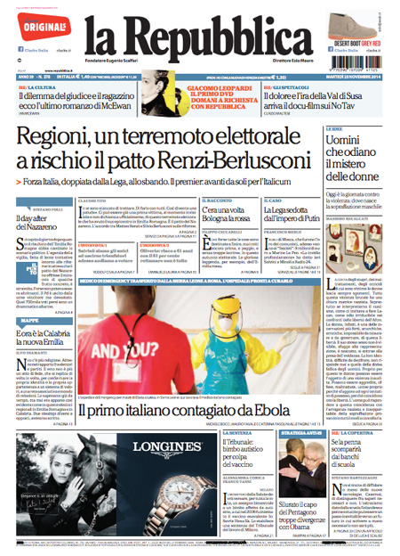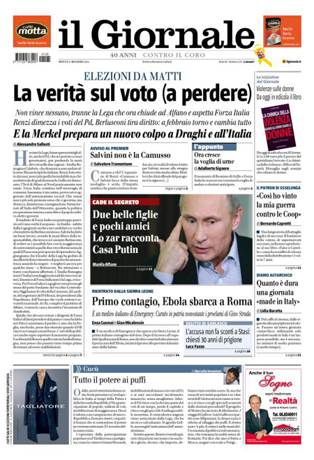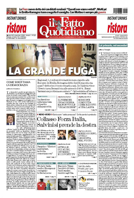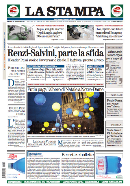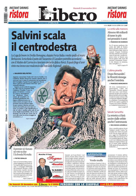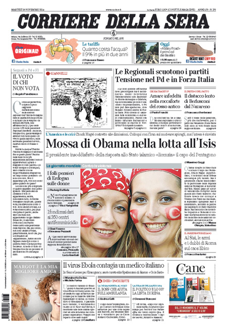 ROMA – Le prime pagine dei giornali di martdì 25 novembre 2014. Renzi-Salvini: le prime pagine dei giornali. Il Corriere della Sera apre con la politica estera: “Mossa di Obama nella lotta all’Isis”. Diversa l’apertura della Stampa che invece punta sulla politica italiana: “Renzi-Salvini, parte la sfida”. Sulle elezioni regionali apre anche La Repubblica: “Regioni, un terremoto elettorale. A rischio il patto Renzi-Berlusconi”. Il Giornale: “La verità sul voto (a perdere)”. Il Fatto Quotidiano: “La grande fuga”.