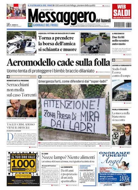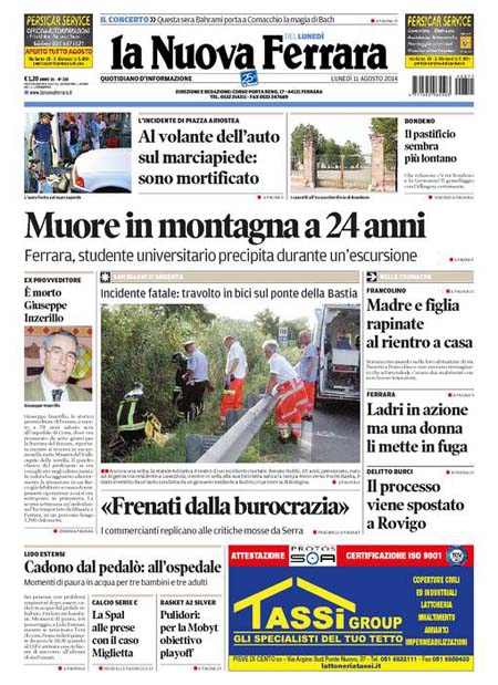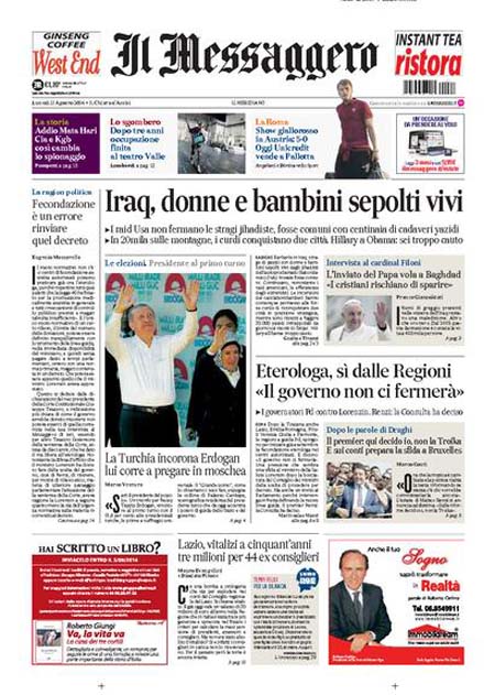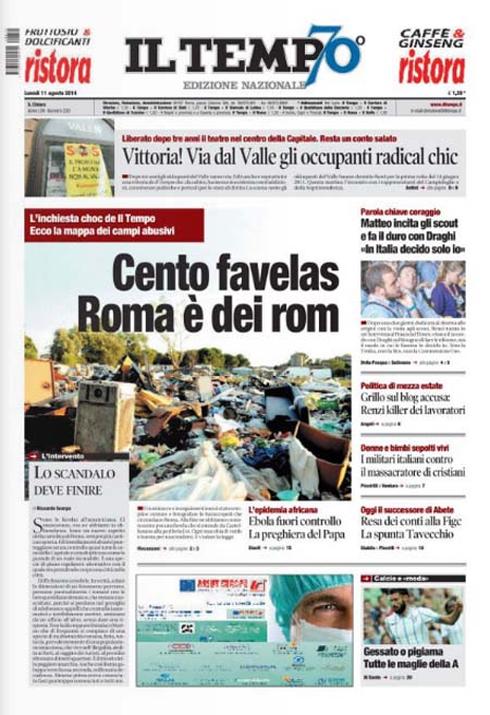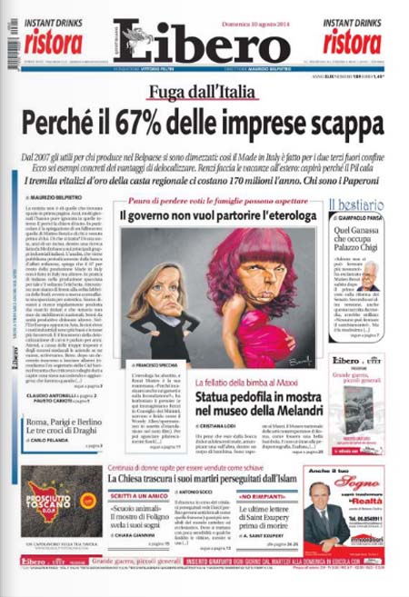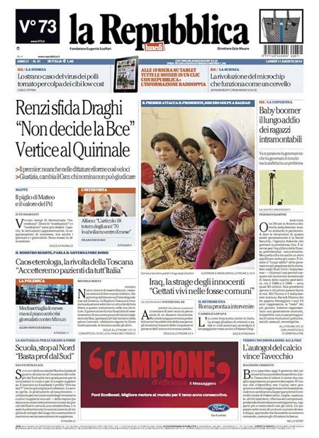 Rassegna Stampa Renzi, tasse, Iraq: le prime pagine dei giornali Gianluca Pace Agosto 11, 2014 Il Corriere della Sera: “Basta con il Fisco repressivo”.La prima pagina di Repubblica: “Renzi sfida Draghi: non decide la Bce”.La Stampa: “Sepolti vivi dagli islamisti”.Il Giornale: “Paghiamo per farci invadere”.