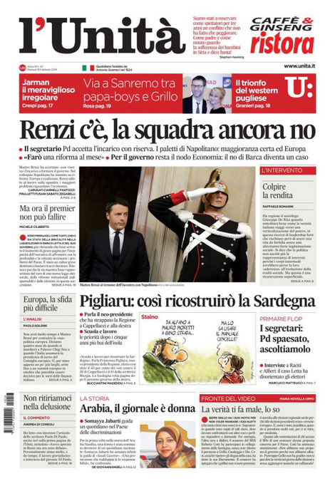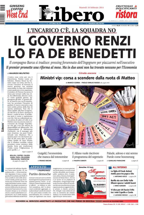 De Benedetti, presunto faccenยญdiere politico, si affretta a smentiยญre, facendo passare Barca per un mitomane. Qualcosa che non quaยญdra perรฒ cโรจ. I nomi che girano per il dicastero dellโEconomia sono Prodi, prima Letta, si rispolvera Amato,resiste Reichlin.Cโรจ il Quiriยญnale che pretende il suo pacchetto di mischia, unโassicurazione per non spaventare la signora Merkel e i burocrati europei. ร la stagione delle pressioni sporche e controยญvento. Renzi che fa, acconsente? Si fa dettare la linea daย Repubblica ,ย il quotidiano con cui รจ in debito, quello che gli ha aperto la strada trafiggendo Letta? Perchรฉ se la siยญtuazione รจ questa meglio andare subito a votare. I premier firmatiย Repubblicaย sono carta straccia.