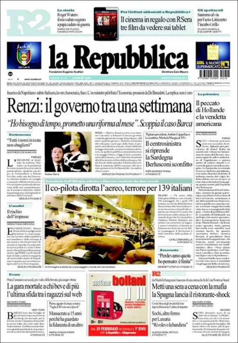 La prima pagina di Repubblica: “Renzi: il governo tra una settimana”.