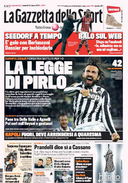 I giornali sportivi puntano molto sulle due partite di Europa League giocate ieri sera che hanno visto la vittoria della Juve in casa della Fiorentina e il conseguente passaggio del turno per i bianconeri.