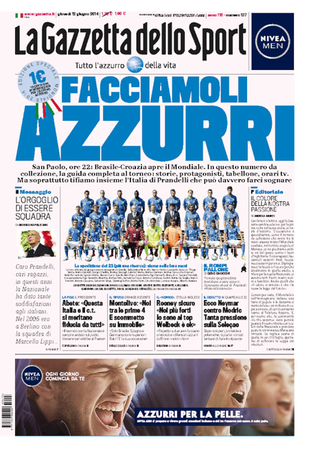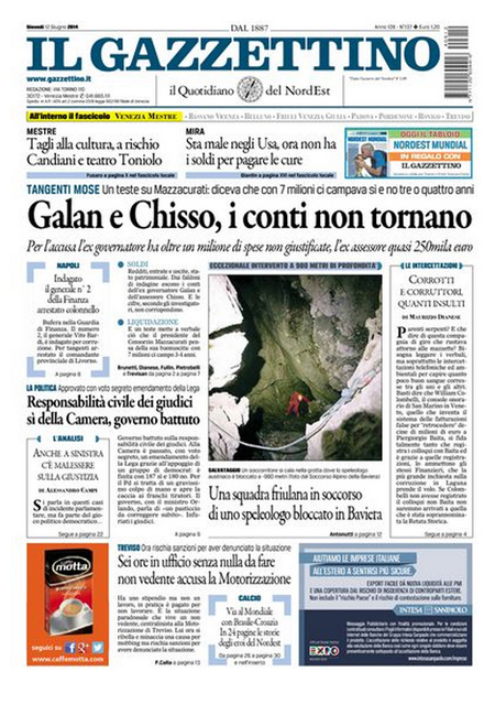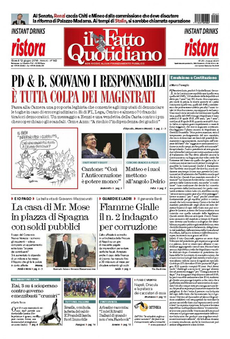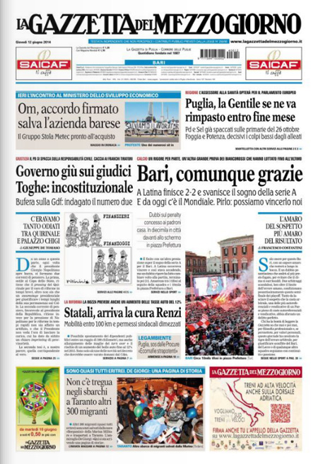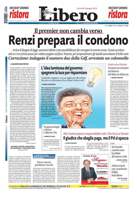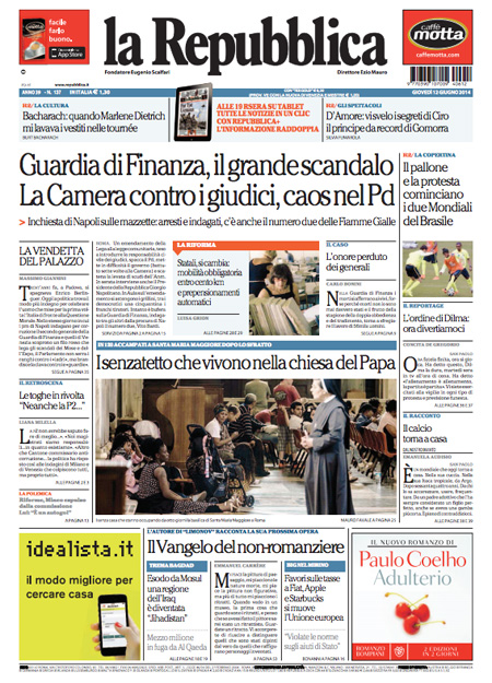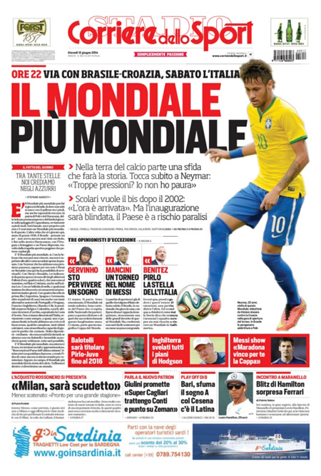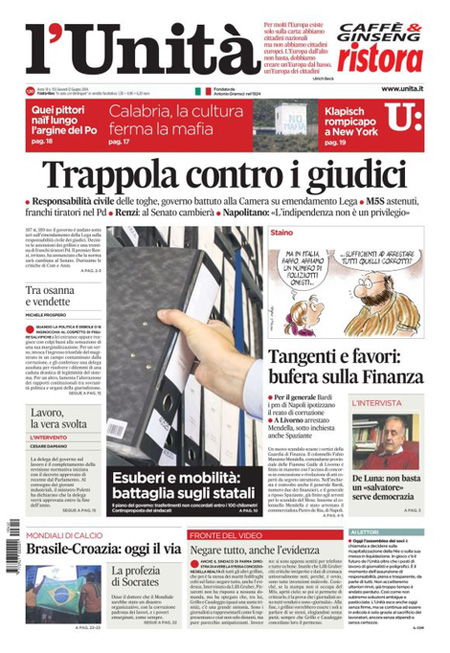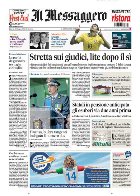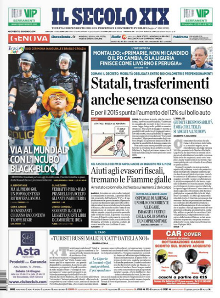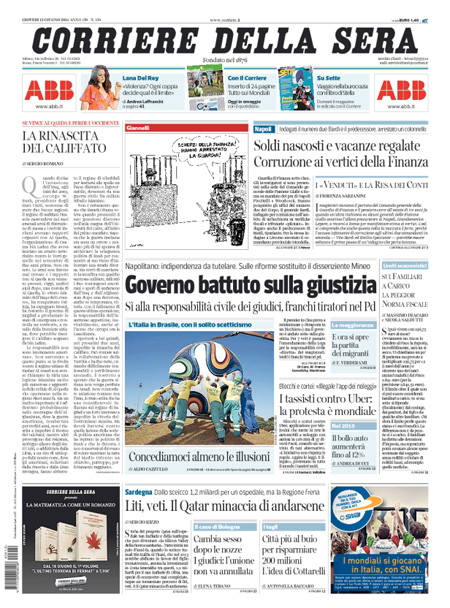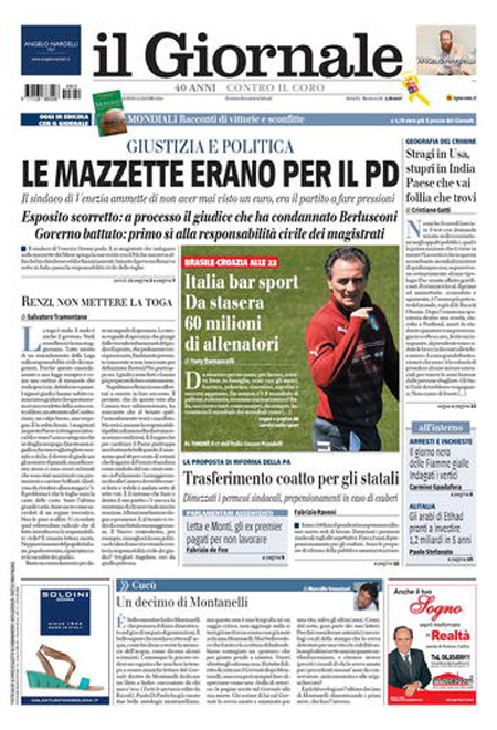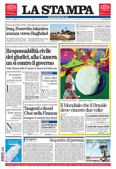 Ma sono diverse le notizie che occupano le prime pagine di oggi: l’indagine sui controlli della Guardia di Finanza a Napoli, che ha portato all’arresto di un colonnello e vede indagato il comandante in seconda del corpo, le anticipazioni sul decreto sui dipendenti statali, che verrà esaminato domani dal consiglio dei ministri, l’avanzata degli estremisti islamici in Iraq, e la partita di stasera fra Brasile e Croazia che darà avvio ai mondiali di calcio, cui la Gazzetta dello Sport dedica una prima pagina tutta azzurra.