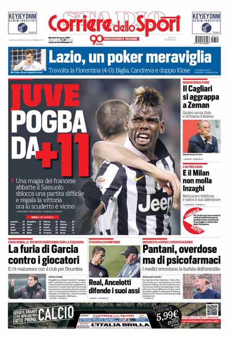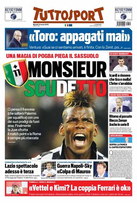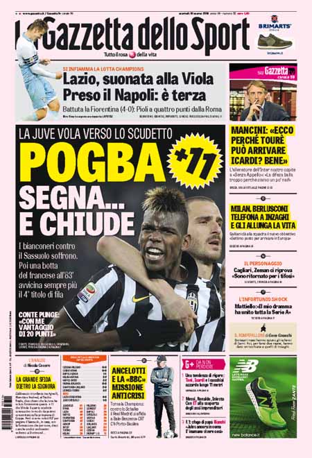I giornali sportivi invece aprono con Paul Pogba, centrocampista francese che ieri ha permesso alla Juventus prima in classifica di allungare a 11 punti il vantaggio sulla Roma, e quindi rendere praticamente certa la vittoria dello Scudetto per la sua squadra.