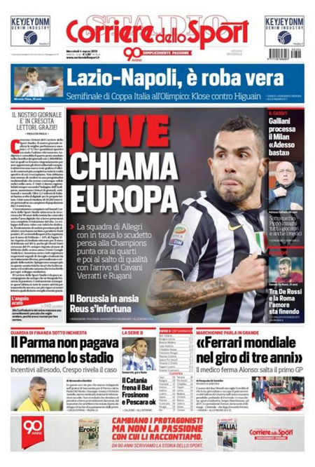 I giornali sportivi danno spazio alla Coppa Italia, stasera si affronteranno Lazio e Napoli, alla situazione in casa Milan e alla Juve che con 9 punti di vantaggio sulla Roma può concentrarsi solo sulla Champions League.