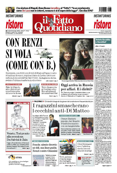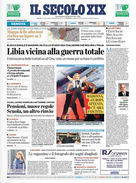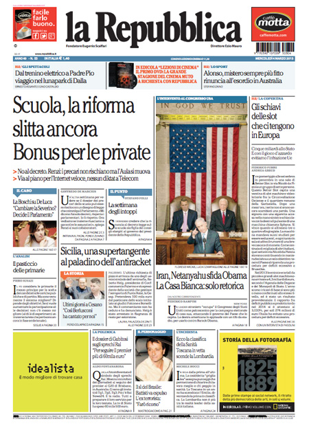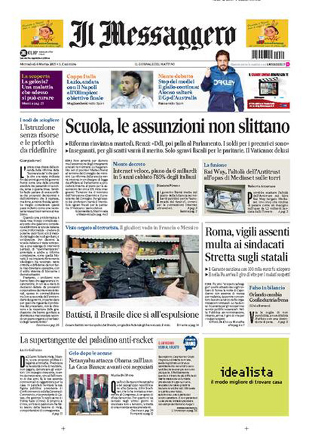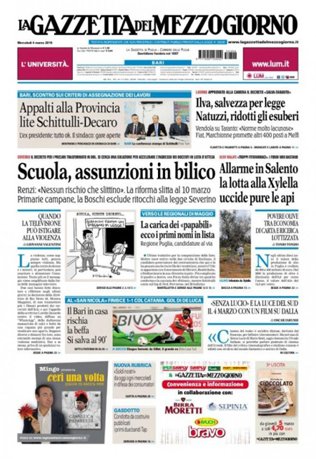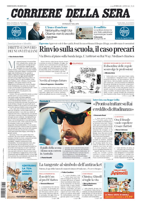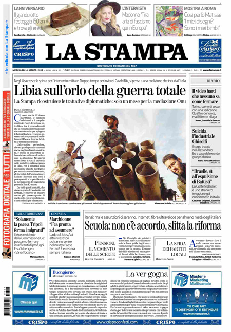 ROMA – La notizia di apertura nei quotidiani di oggi, mercoledì 4 marzo, è la riforma della scuola, che doveva essere esaminata nel Consiglio dei ministri di ieri ma è stata rinviata a un disegno di legge che dovrebbe essere approvato la settimana prossima, con l’assicurazione da parte del governo che le assunzioni dei precari non slitteranno. La Stampa titola invece sulle trattative diplomatiche per un intervento militare in Libia.