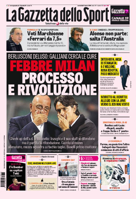 I giornali sportivi danno spazio alla Coppa Italia, stasera si affronteranno Lazio e Napoli, alla situazione in casa Milan e alla Juve che con 9 punti di vantaggio sulla Roma può concentrarsi solo sulla Champions League.