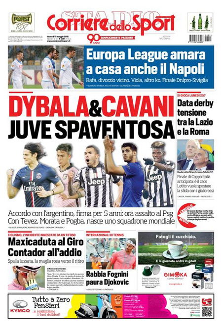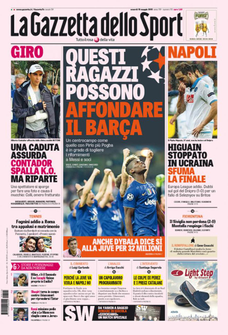 I giornali sportivi danno ancora spazio all’impresa della Juventus in Champions di mercoledì, all’eliminazione in semifinale di Europa League del Napoli e della Fiorentina e al calciomercato.