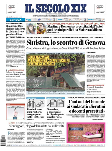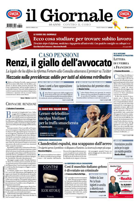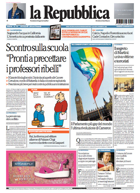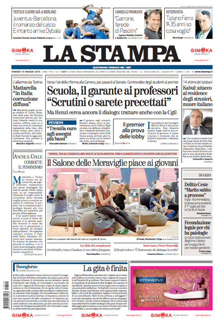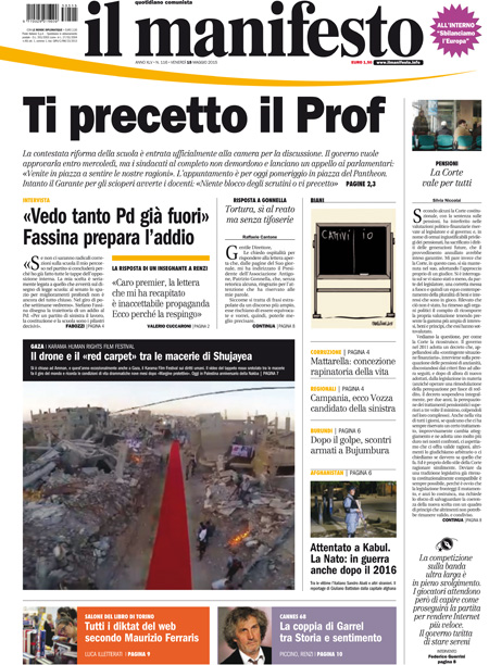 ROMA – Per molti giornali di oggi, venerdì 15 maggio, la notizia di apertura sono le proteste della scuola per la riforma presentata dal governo, e l’intervento di ieri del garante per gli scioperi che ha minacciato di precettazione gli insegnanti in caso decidessero per il blocco degli scrutini.