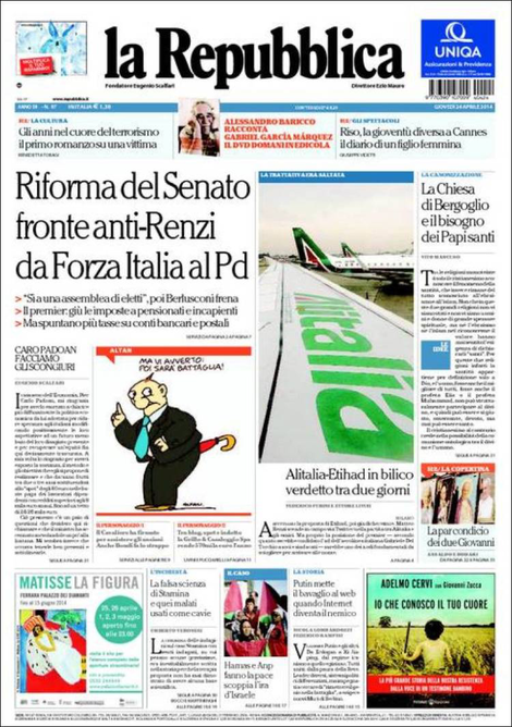 La prima pagina de La Repubblica: “Riforma del Senato. Fronte anti-Renzi da Forza Italia al Pd”.