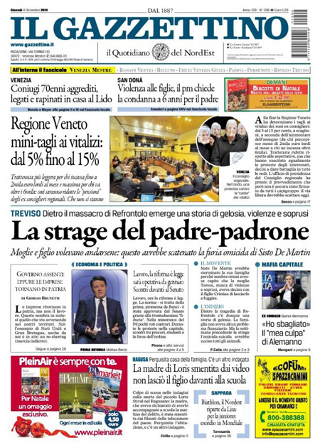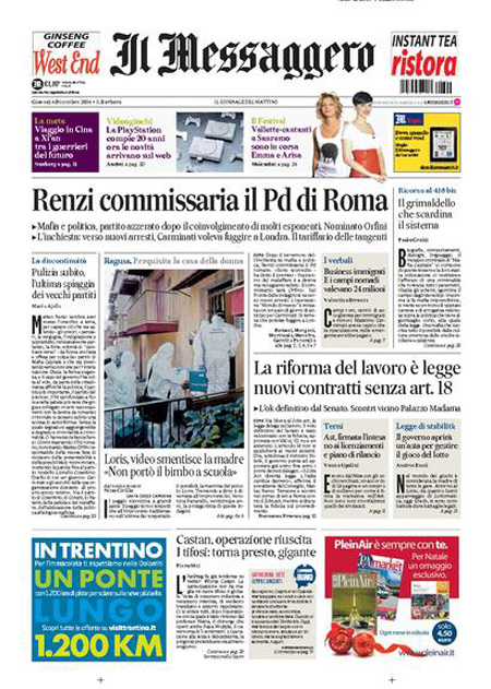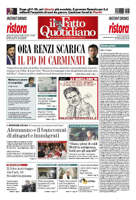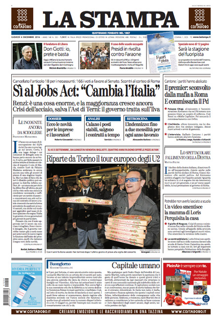 ROMA – Le prime pagine dei giornali di giovedì 4 dicembre 2014. La Stampa: “Sì al Jobs Act. Renzi: è una cosa enorme”. Il Corriere della Sera: “Il tariffario dei politici. Buste con 370mila euro nell’abitazione di un funzionario del Comune”. La Repubblica: “Il tariffario dei politici corrotti. Scure di Renzi sul Pd di Roma”. La prima pagina de Il Messaggero: “Renzi commissaria il Pd di Roma”. Il Giornale: “La cupola controllava i voti Pd”. Il Fatto Quotidiano: “Ora Renzi scarica il Pd di Carminati”. La prima pagina di Libero: “Il grande affare degli immigrati”.