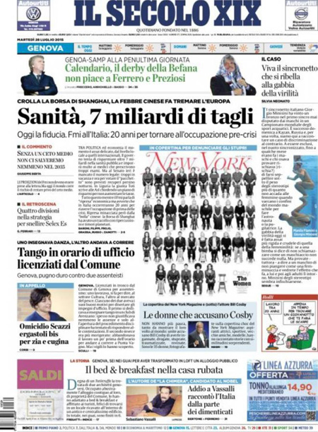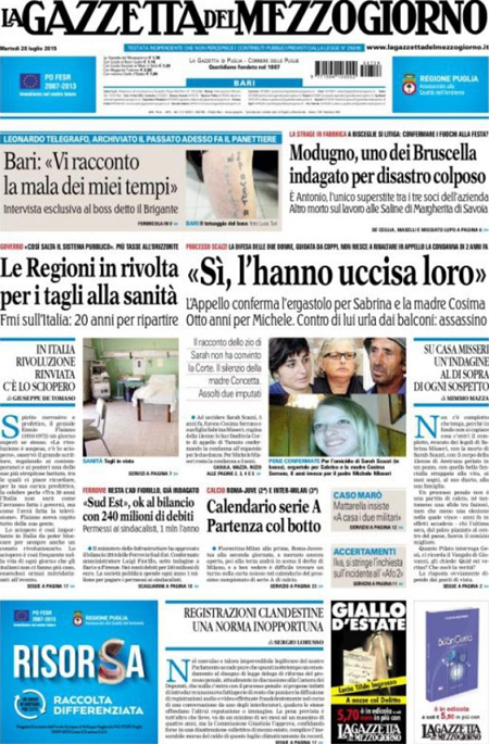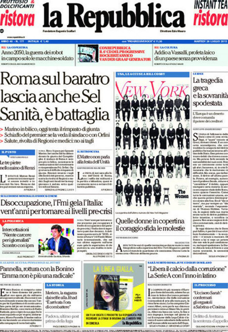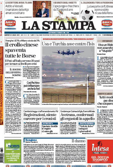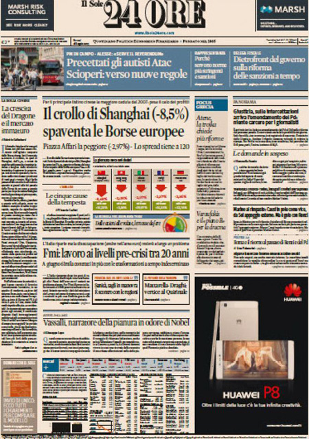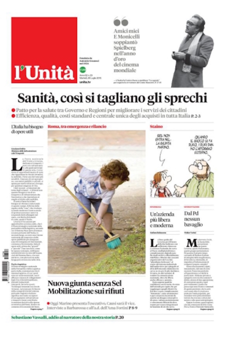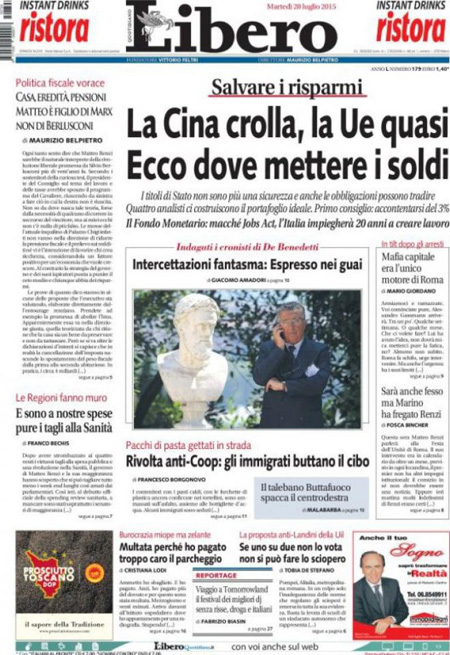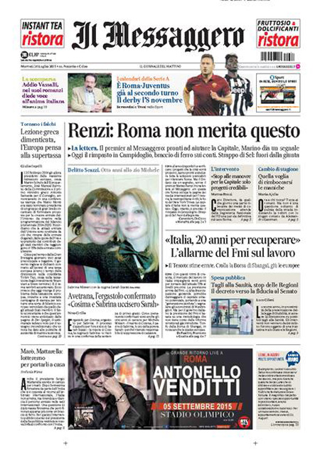 ROMA – I giornali nazionali oggi, 28 luglio, aprono con tre notizie diverse: le previsioni del Fondo Monetario Internazionale sui tempi necessari affinché in Italia l’occupazione ritorni ai livelli di prima della crisi, il crollo delle borse cinesi e i rinnovati problemi di Ignazio Marino a Roma, dopo che SEL ha deciso di non partecipare alla nuova giunta. Si parla poi della morte di Sebastiano Vassalli, uno dei più importanti scrittori italiani, che aveva 73 anni.