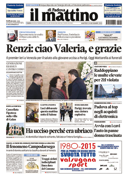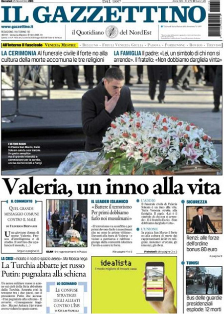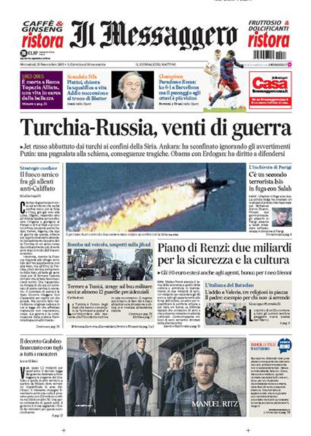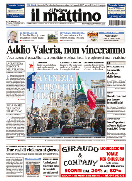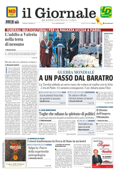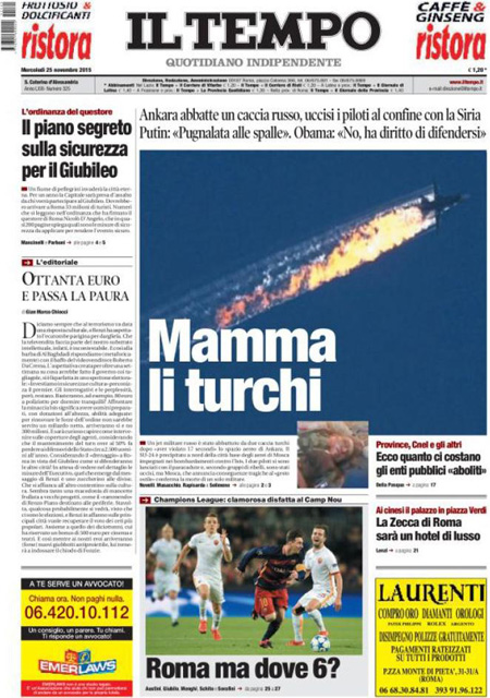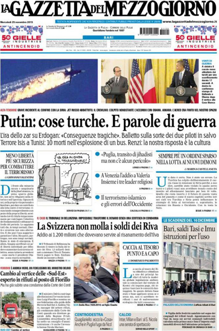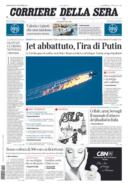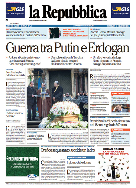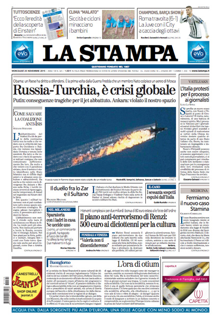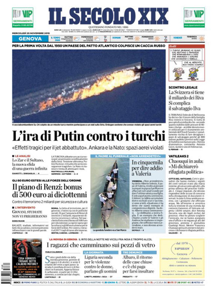 La prima pagina del Giornale: “Guerra mondiale. A un passo dal baratro”. La prima pagina de L’Unità: “Se questa è una coalizione. E’ guerra, ma tra chi dovrebbe stare dalla stessa parte. La Turchia abbatte jet russo”. La prima pagina di Libero: “Crisi internazionale. Diamo soldi ai turchi e loro aiutano l’Isis”. La prima pagina de Il Manifesto: “Il colpo del Sultano”. La prima pagina del Secolo XIX: “L’ira di Putin contro i turchi”. La prima pagina de Il Tempo: “Mamma li turchi. Ankara abbatte un caccia russo, uccisi i piloti al confine con la Siria”. La prima pagina del Gazzettino: “Valeria, un inno alla vita”. La prima pagina de Il Mattino di Padova: “Addio Valeria, non vinceranno”. Queste le prime pagine dei giornali di mercoledì 25 novembre.