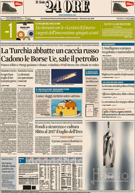 ROMA – Le prime pagine dei giornali di mercoledì 25 novembre. La prima pagina de La Stampa: “Russia-Turchia, è crisi globale”. La prima pagina de Il Corriere della Sera: “Jet abbattuto, l’ira di Putin”. La prima pagina de La Repubblica: “Guerra tra Putin e Erdogan”. La prima pagina de Il Sole 24 Ore: “La Turchia abbatte un caccia russo. Cadono le borse Ue, sale il petrolio”. La prima pagina del Messaggero: “Turchia-Russia, venti di guerra”.