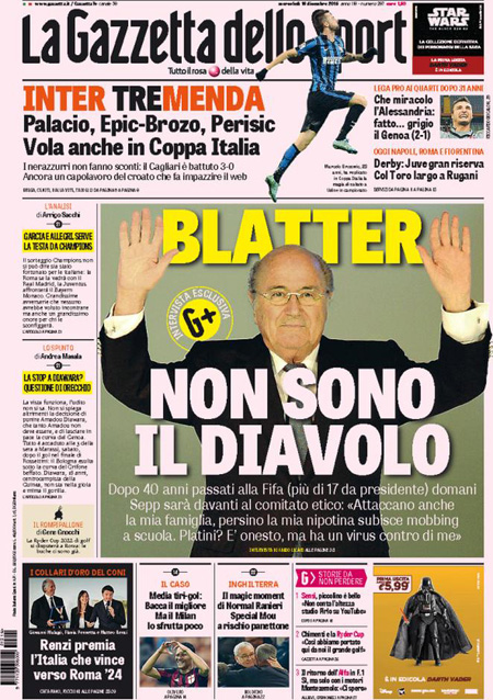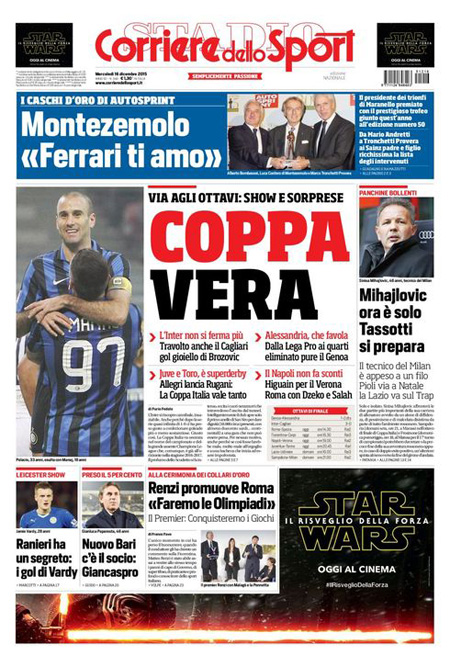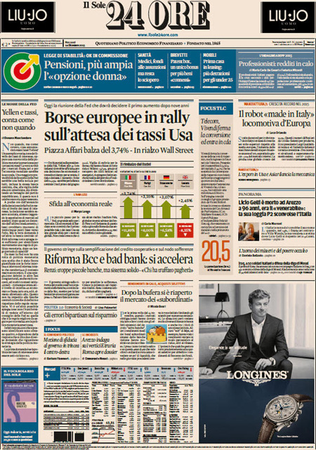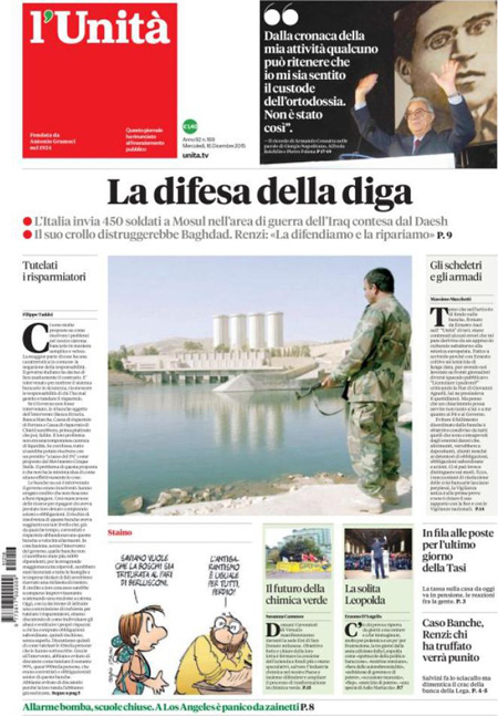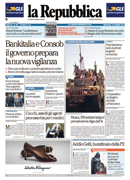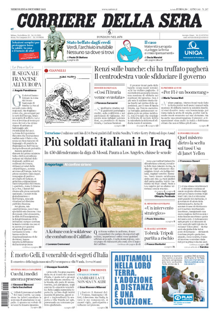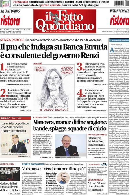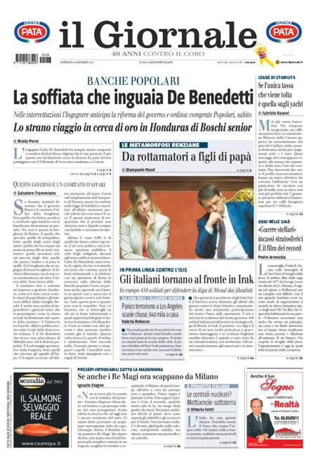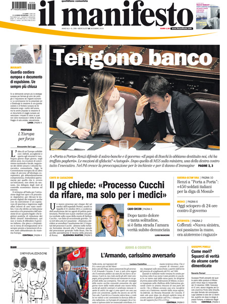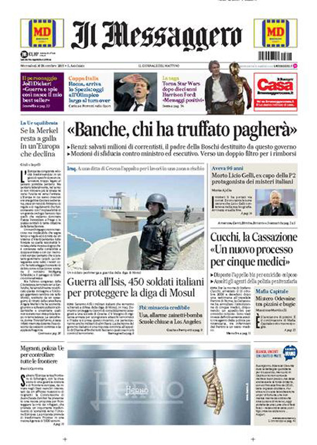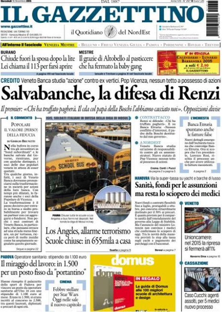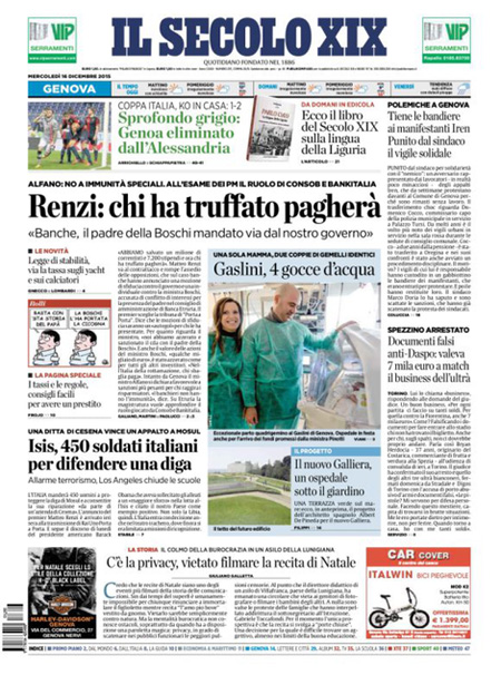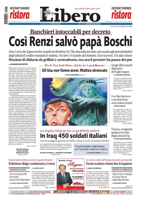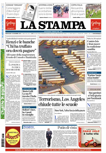 ROMA – I giornali di oggi, 16 dicembre, aprono ancora sulla vicenda delle quattro banche salvate dal fallimento da un decreto del governo, con l’intervento del Presidente del Consiglio Renzi a Porta a Porta, durante il quale ha difeso l’azione del governo e ha dichiarato che chi ha sbagliato pagherà, e la mozione di sfiducia al governo presentata dal centrodestra. Le altre notizie che occupano le prime pagine sono la morte di Licio Gelli, la decisione della Cassazione di rinviare a un nuovo processo il giudizio sui medici accusati per la morte di Stefano Cucchi, e l’allarme terrorismo di ieri a Los Angeles.