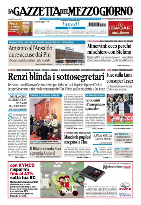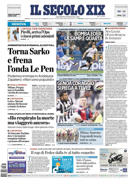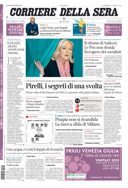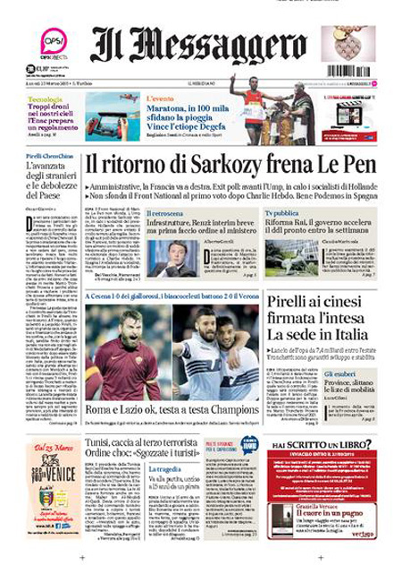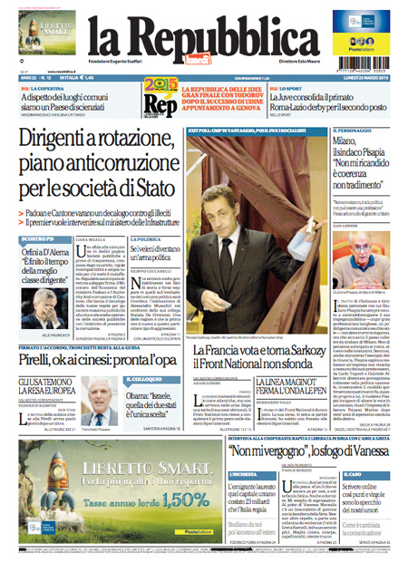 ROMA – I quotidiani di oggi, 23 marzo, con la vittoria del partito dell’ex Presidente Sarkozy, che supera l’estrema destra di Le Pen data per favorita alla vigilia delle elezioni amministrative in Francia. Repubblica titola invece con un’anticipazione sul piano del governo contro la corruzione nelle società statali.
