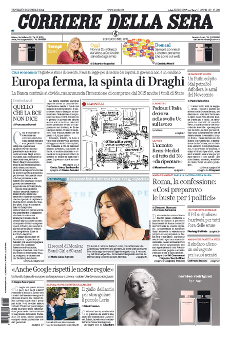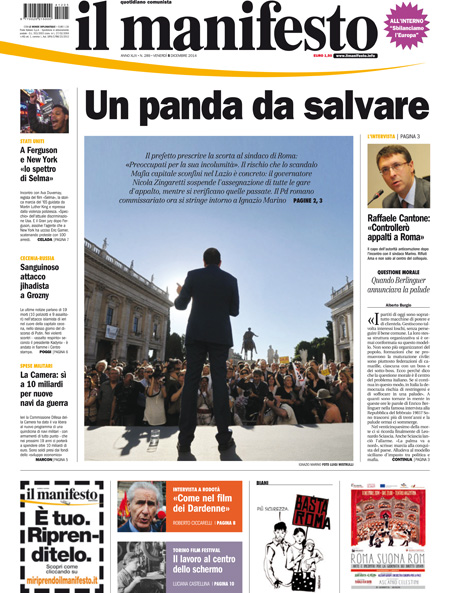 ROMA – Le prime pagine di venerdì 5 dicembre 2014. La Stampa: “Roma, ipotesi di commissariamento. Il prefetto: stiamo valutando”. Il Corriere della Sera: “Europa ferma, la spinta di Draghi”. La Repubblica: “Mafia, il sacco di Roma. Così la banda nera si spartiva gli appalti milionari”. Il Sole 24 Ore: “Stimoli Bce in stand-by. Seduta nera per i mercati”. Il Messaggero: “La segretaria del braccio destro di Carminati è la prima a confessare: soldi ai politici, così li pagavo”. Il Giornale: “Lo scandalo si allarga: il ministro mangia e piange”. Il Manifesto: “Un panda da salvare”.