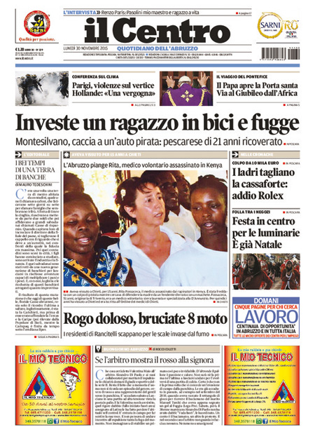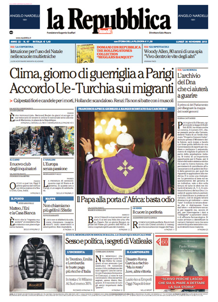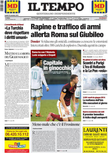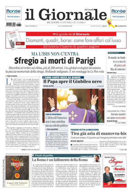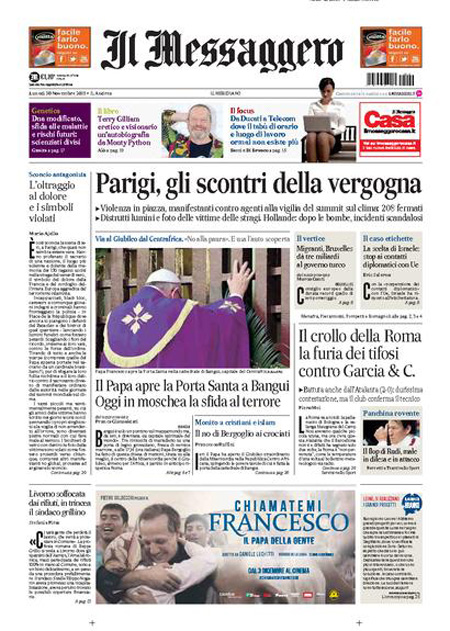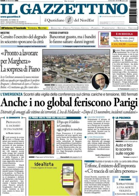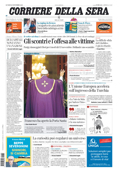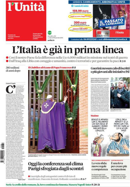 Il Messaggero: “Parigi, gli scontri della vergogna. Violenza in piazza, manifestazione contro agenti alla vigilia del summit sul clima”. Il Giornale: “Sfregio ai morti di Parigi. Ma l’Isis non c’entra. Disordini ai vertici sul clima, piรน di 200 arresti. I no global devastano la piazza-memoriale della strage, Hollande indignato. E nei sondaggi Le Pen vola”. L’Unitร : “L’Italia รจ giร in prima linea. Cosรฌ il nostro paese fa la differenza nella Ue: 6.000 militari in missione nei teatri di guerra”. Libero: “L’accordo suicida. Regaliamo 281 milioni ai turchi (per farci invadere meglio)”. Queste le prime pagine di lunedรฌ 30 novembre.