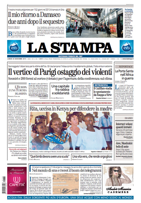 ROMA – Le prime pagine dei giornali di lunedรฌ 30 novembre. La prima pagina della Stampa: “Il vertice di Parigi ostaggio dei violenti. Scontri e 200 fermi al corteo (vietato) per l’apertura della conferenza sul clima”. La prima pagina de Il Corriere della Sera: “Gli scontri e l’offesa alle vittime. Parigi, danneggiati i fiori per i morti del 13 novembre. Hollande: uno scandalo”. La prima pagina de La Repubblica: “Clima, giorno di guerriglia a Parigi. Accordo Ue-Turchia sui migranti. Calpestati fiori e candele per i morti. Hollande: scandaloso. Renzi: l’Is non si batte con i muscoli”. La prima pagina del Sole 24 Ore: “La nuova mappa dei controlli per i capitali in fuga dal fisco”.