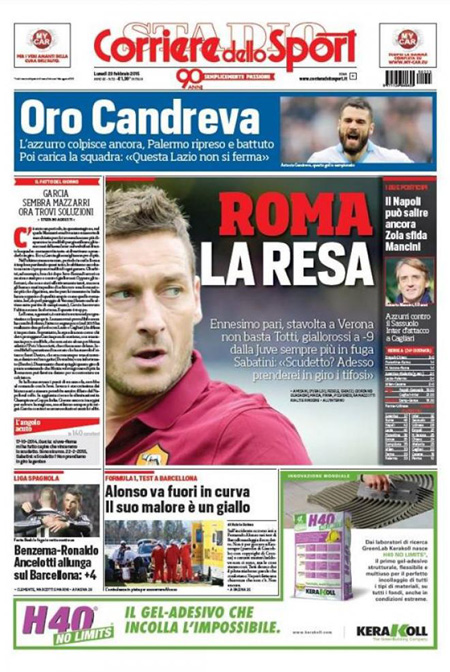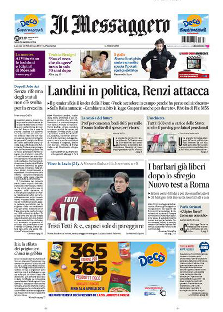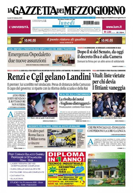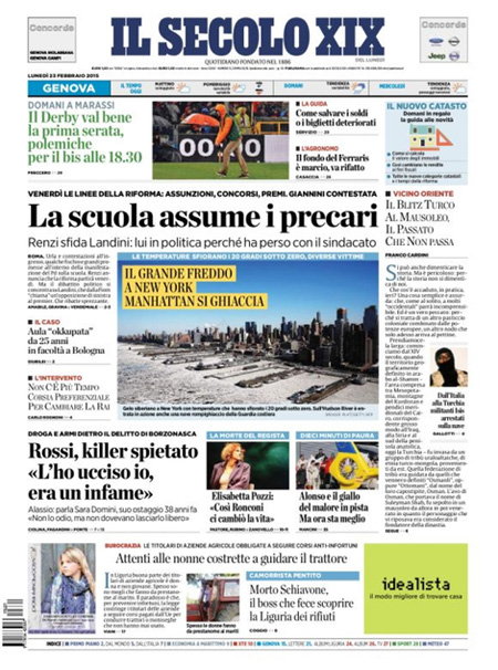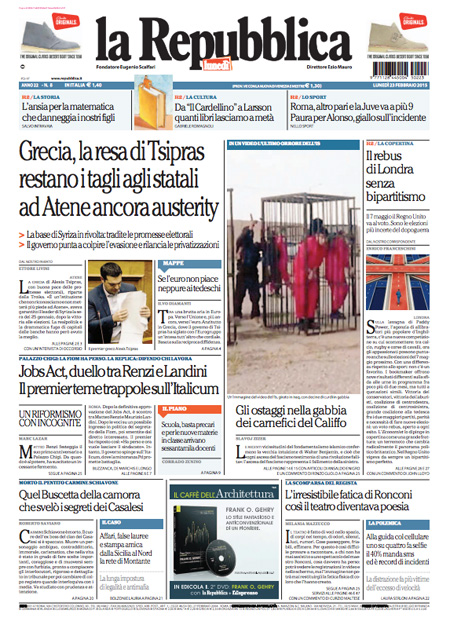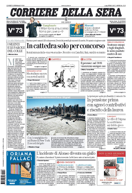 ROMA – Le prime pagine dei giornali di lunedì 23 febbraio. La Stampa: “Scuola, nuove regole per i precari”. Il Corriere della Sera: “In cattedra solo per concorso”. La Repubblica: “Grecia, la resa di Tsipras. Restano i tagli agli statali. Ad Atene ancora austerity”. Il Messaggero: “Landini in politica, Renzi attacca”.