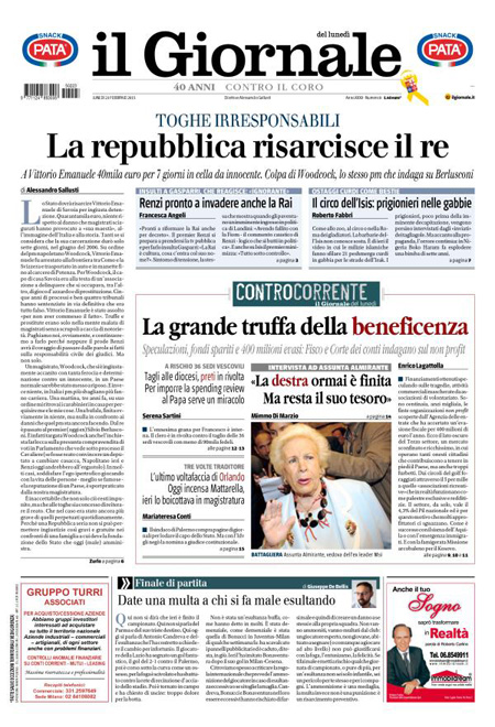 Il Giornale: “Toghe irresponsabili. La repubblica risarcisce il re”. Il Tempo: “In affittopoli spuntano i rom. Nuovi elenchi, tremano i vip”. La Gazzetta dello sport: “Milan, 3 punti di sutura”. Il Corriere dello Sport: “Roma, la resa”. Tuttosport: “Juventus col vento in poppa”.