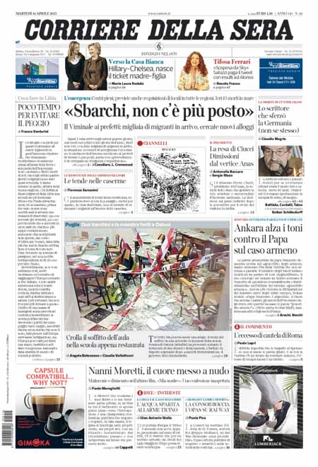 ROMA – Le prime pagine dei giornali di martedì 14 aprile. Il Corriere della Sera: “Il Viminale: sbarchi non c’è più posto”. La Repubblica: “Fisco, basta blitz e più controlli bancari. Inps: cambia la Fornero, pensioni flessibili”.