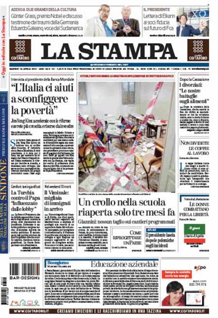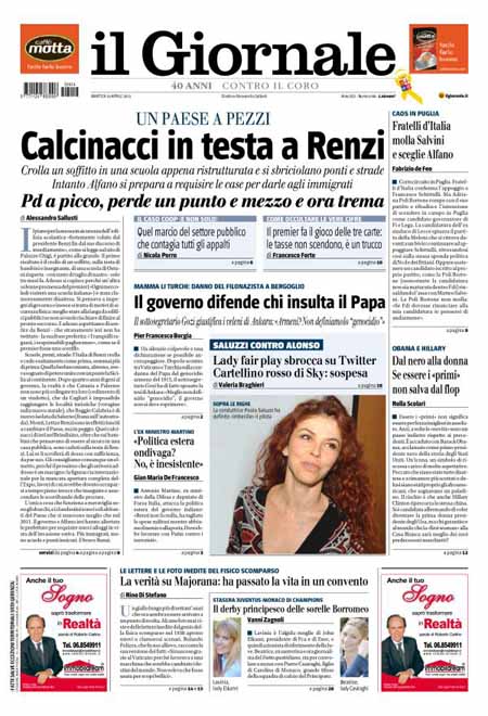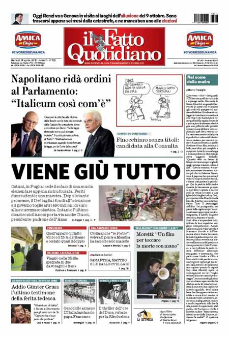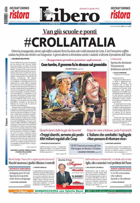 Il Giornale: “Un paese a pezzi. Calcinacci in testa a Renzi”. Il Fatto Quotidiano: “Viene giù tutto”. Libero: “Van giù scuole e ponti. #CrollaItalia”.