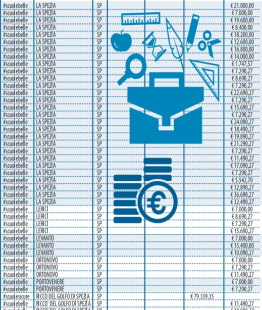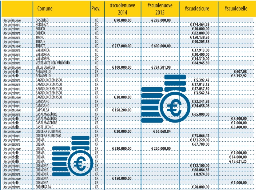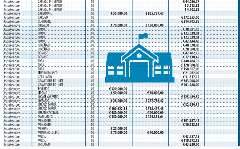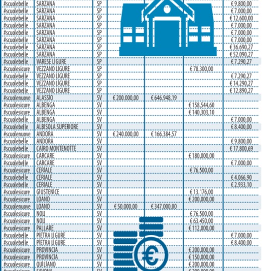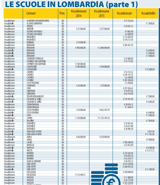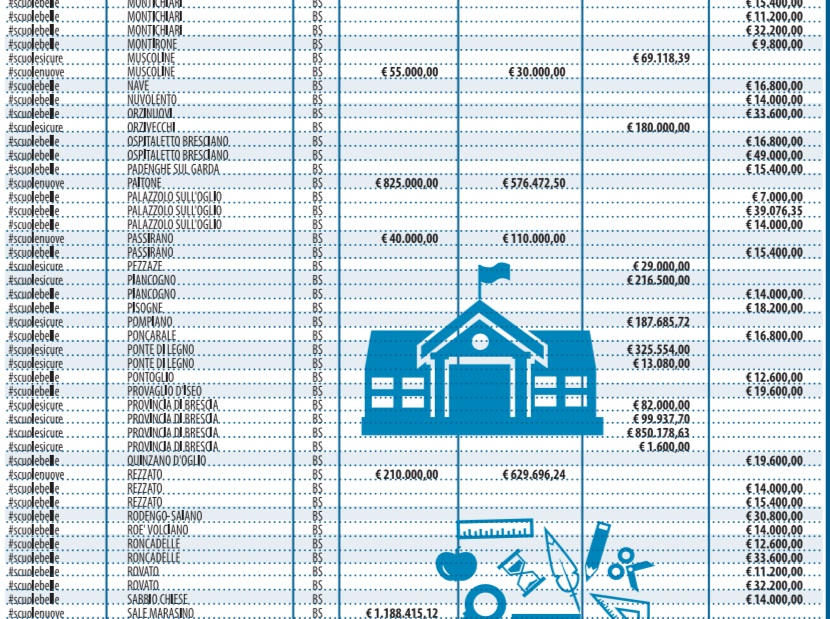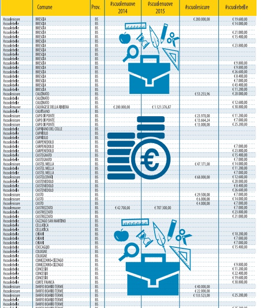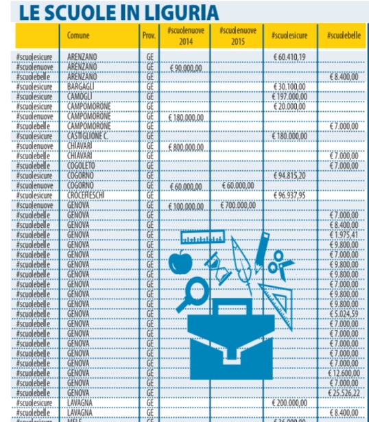 Sul sito del governo è pubblicato l’elenco regione per regione degli stanziamenti messi in cantiere. Così Libero ha deciso di pubblicarli suddivisi per categorie. Sotto l’hashtag #scuolenuove si nascondono i 404 cantieri in corso o in procinto di aprire per circa 400 milioni (grazie alla liberazione di risorse dei comuni dai vincoli del patto di stabilità). Dietro #scuolesicure, invece, si celano i 400 milioni che dovrebbero servire alla messa in sicurezza e all’agibilità. Mentre con #scuolebelle si parla di decoro e piccola manutenzione.