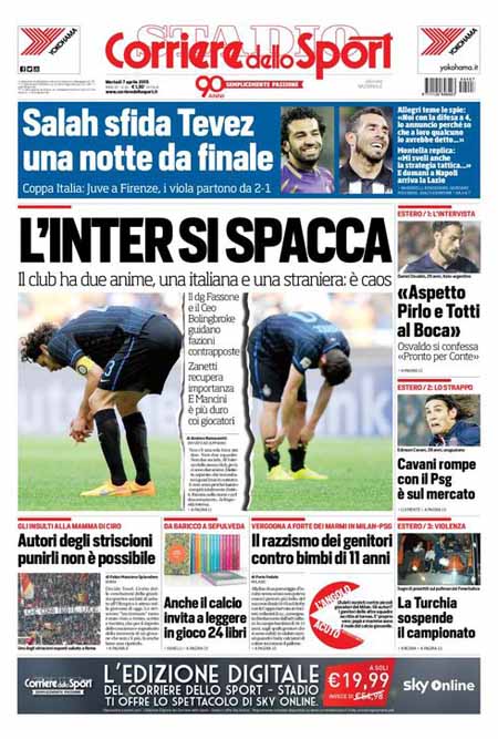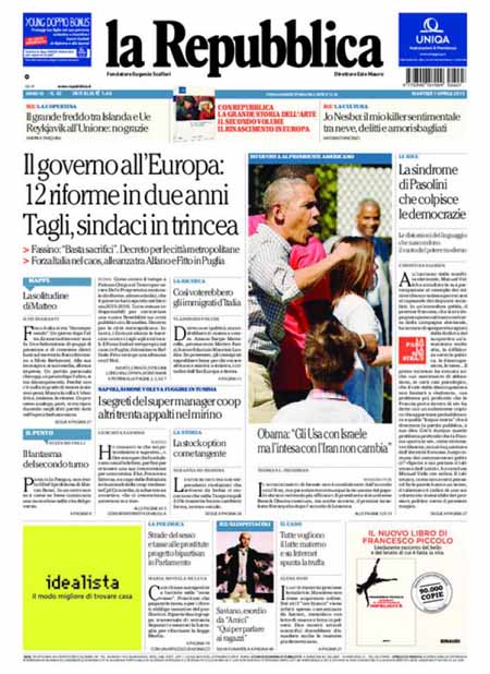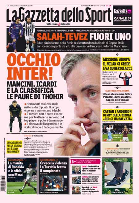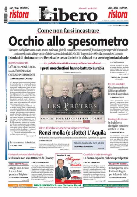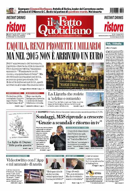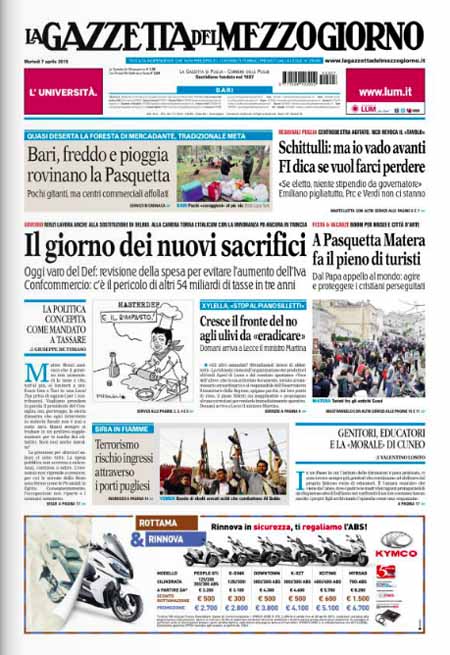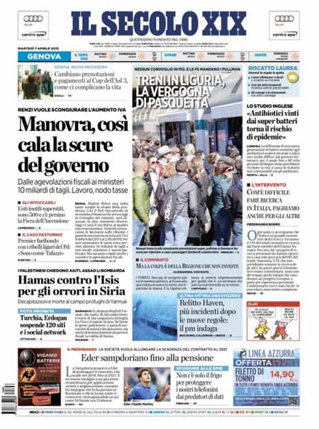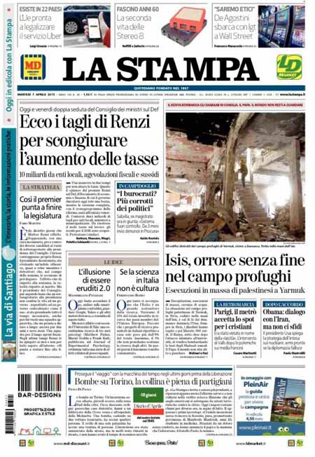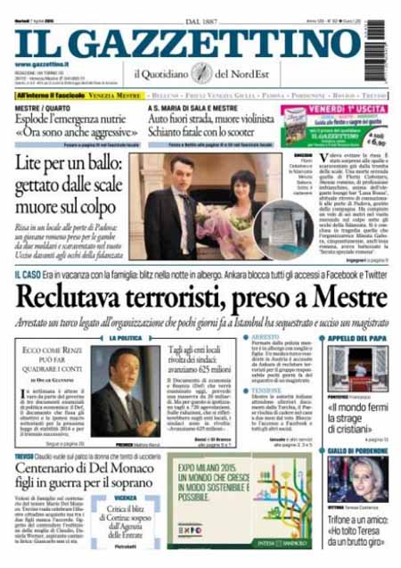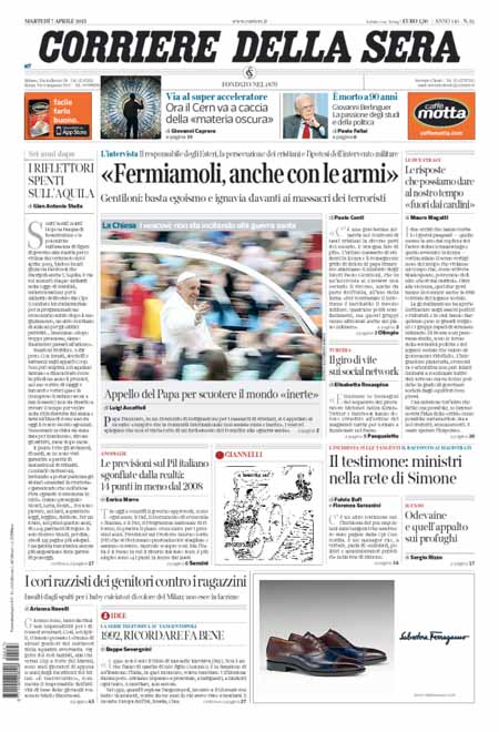 ROMA – Le prime pagine dei giornali di oggi, 7 aprile, dopo un giorno di pausa, aprono con varie notizie: il Corriere della Sera apre con un’intervista al ministro Paolo Gentiloni, Repubblica e la Stampa con titoli sulla politica economica del governo. Si parla molto anche delle violenze dell’Isis in Siria, mentre i giornali sportivi sono concentrati sulla semifinale di Coppa Italia tra Juventus e Fiorentina che si giocherà stasera.