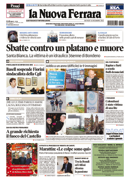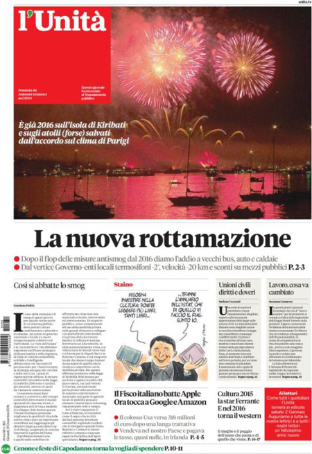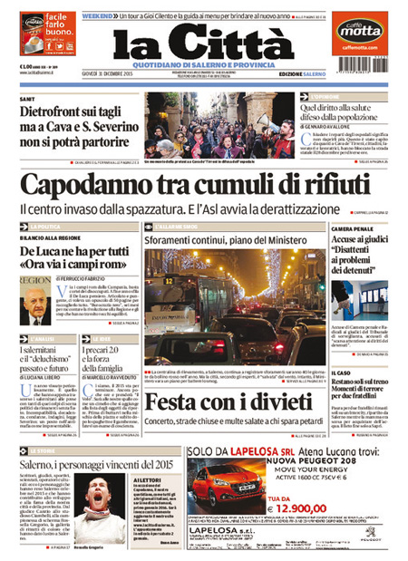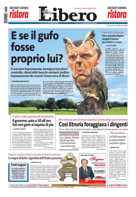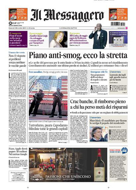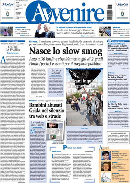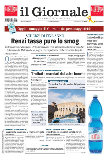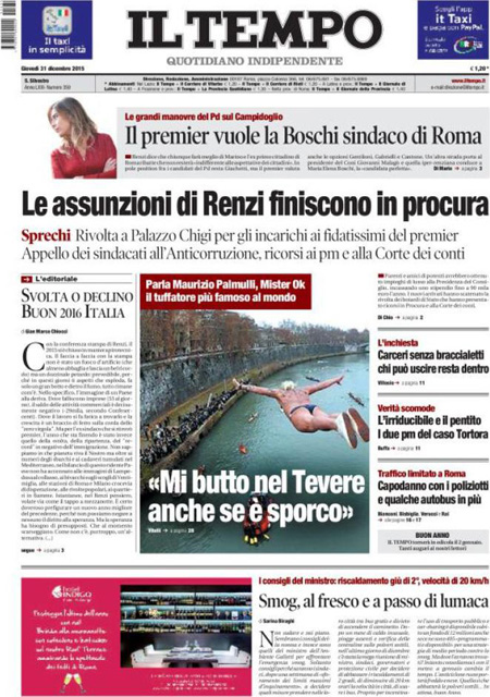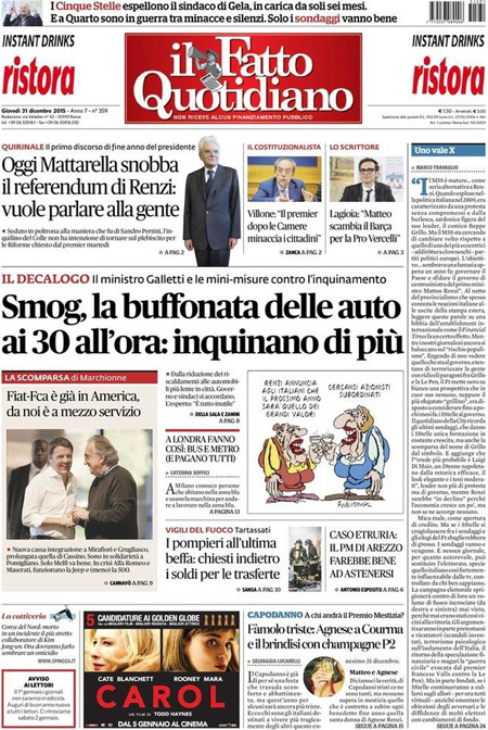 La prima pagina del Messaggero: “Piano anti-smog, ecco la stretta”. La prima pagina del Giornale: “Scherzi di primo anno. Renzi tassa pure lo smog”. Il Manifesto: “Cambiamo aria”. La prima pagina di Avvenire: “Nasce lo slow smog”. La prima pagina del Fatto Quotidiano: “Smog, la buffonata delle auto ai 30 all’ora: inquinano di piรน. Il ministro Galletti e le mini-misure contro l’inquinamento”. La prima pagina di Libero: “E se il gufo fosse proprio lui?”. Il Tempo: “Le assunzioni di Renzi finiscono in procura”. Queste le prime pagine dei giornali di giovedรฌ 30 dicembre.