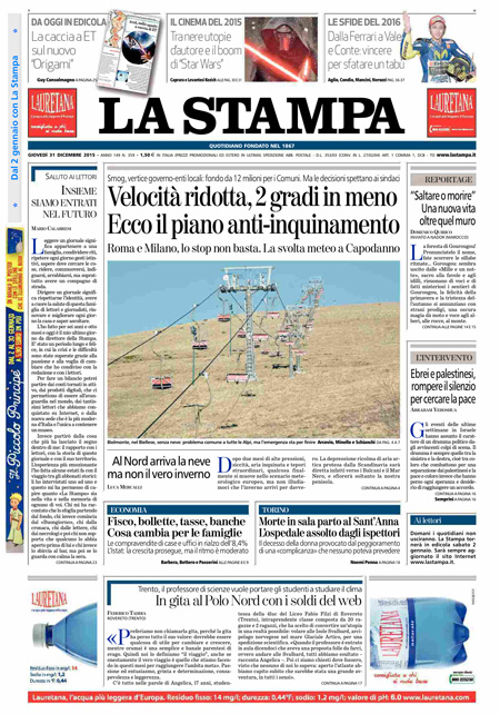 ROMA – Queste le prime pagine dei giornali di giovedรฌ 31 dicembre. La prima pagina della Stampa: “Velocitร ridotta, 2 gradi in meno. Ecco il piano anti inquinamento”. La prima pagina del Corriere della Sera: “Uffici meno caldi e auto piรน lente: il patto anti smog”. La prima pagina de La Repubblica: “Lo smog continua a salire. Via al piano anti consumi. Il governo: riscaldamento in casa giรน di 2 gradi, auto a 30 km/h in cittร ”.