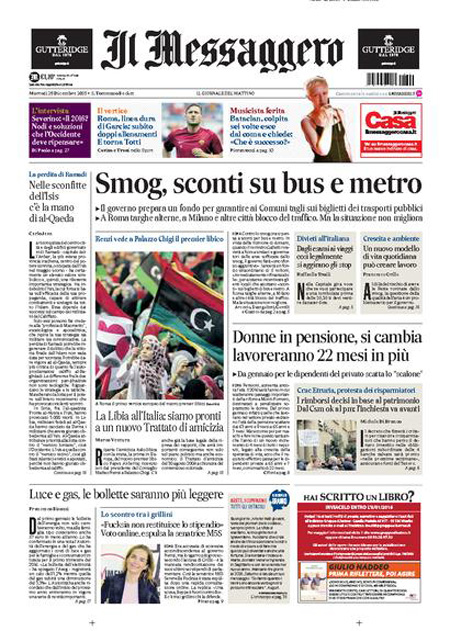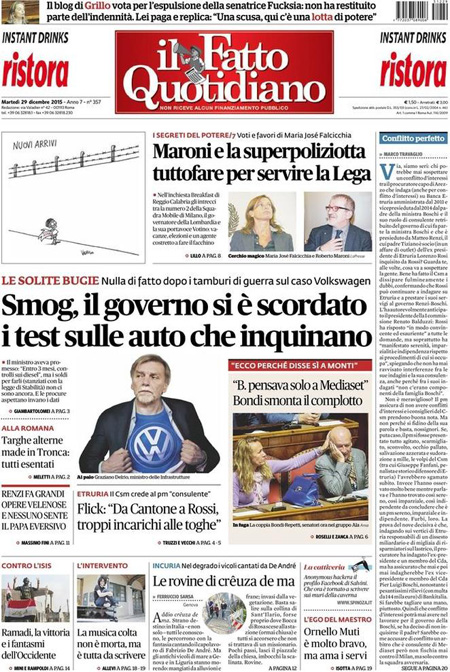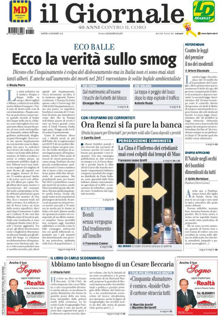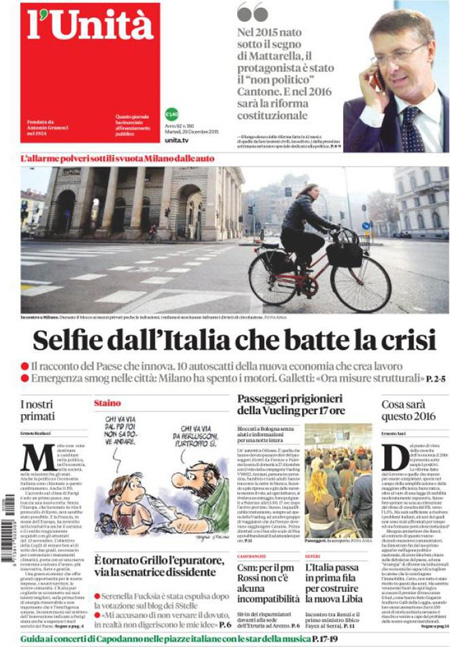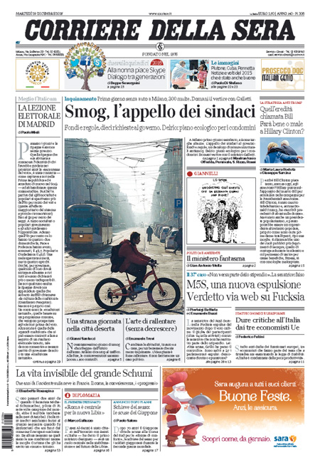 ROMA – Tutti i giornali di oggi, 29 dicembre, si occupano in apertura dei blocchi del traffico che sono stati attuati da ieri in molte città per cercare di abbassare i livelli di inquinamento, con molte immagini di strade di Milano vuote o percorse solo da biciclette, e delle iniziative di governo e regioni per coordinare l’azione per la riduzione dello smog.