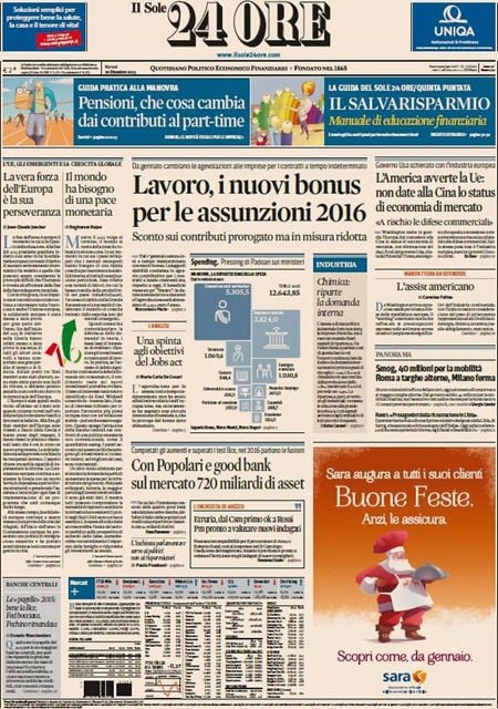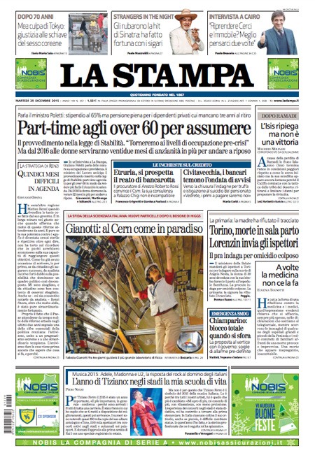 La Stampa e il Sole 24 Ore titolano sui provvedimenti contenuti nella legge di stabilità per aumentare l’occupazione e sui cambiamenti alle pensioni per le donne dovuti all’entrata in vigore della riforma Fornero.