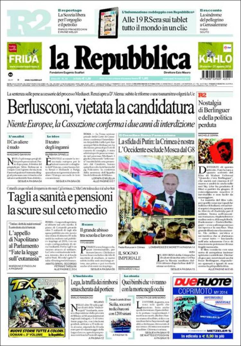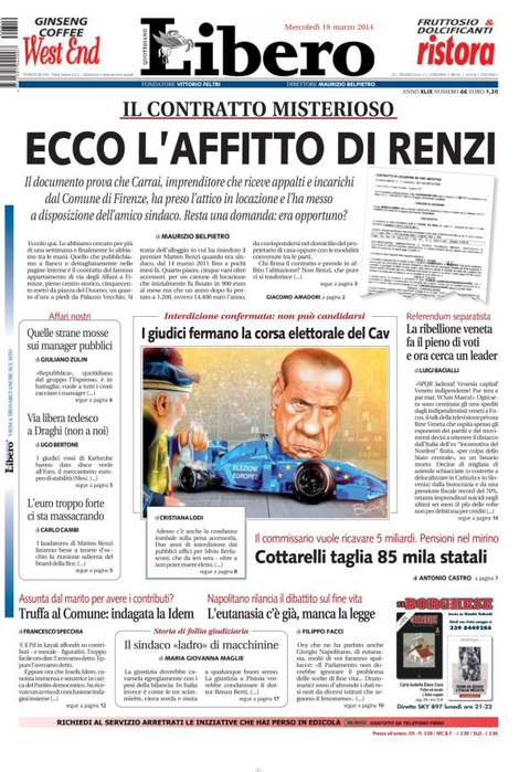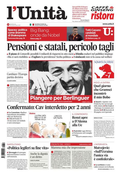 ROMA – Le aperture dei giornali di oggi 19 marzo sono le anticipazioni sul piano per la spending review presentato dal commissario Cottarelli, che prevederebbe tagli per 5 miliardi e un intervento anche sugli esuberi nel pubblico impiego, e la decisione della Corte di Cassazione, che ha confermato l’interdizione per due anni per Silvio Berlusconi, e quindi la sua incandidabilità per le prossime elezioni europee.