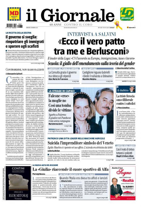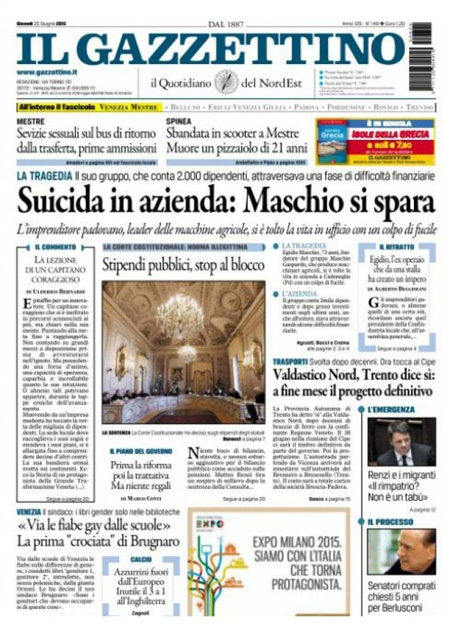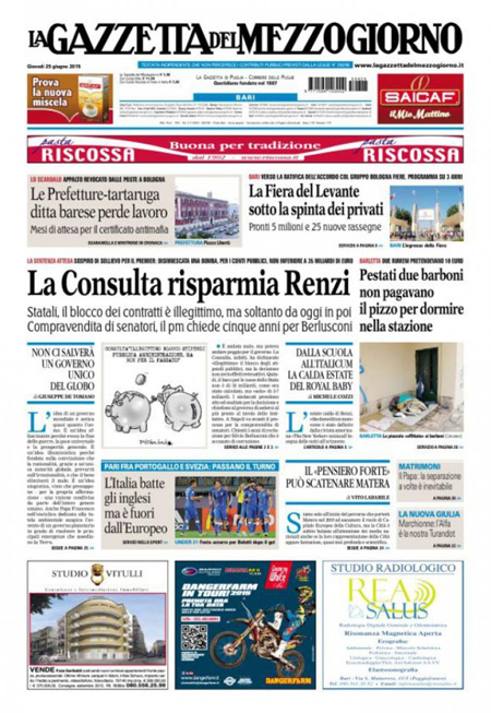 Spazio su diverse prime pagine lo trova anche la presentazione della nuova Alfa Romeo Giulia, un modello che dovrebbe riportare Alfa a competere con i marchi di lusso tedeschi, e su diversi giornali si parla ancora dei problemi della giunta comunale di Roma e del sindaco Ignazio Marino. Sui giornali sportivi: un nuovo obbiettivo di mercato per l’Inter e l’addio di Tevez alla Juventus.