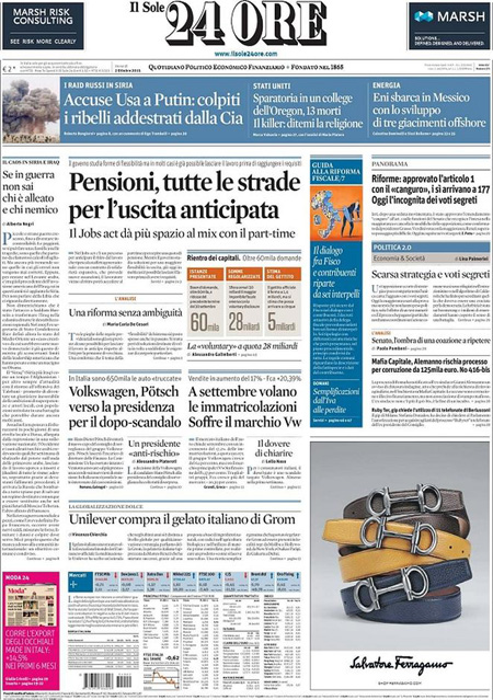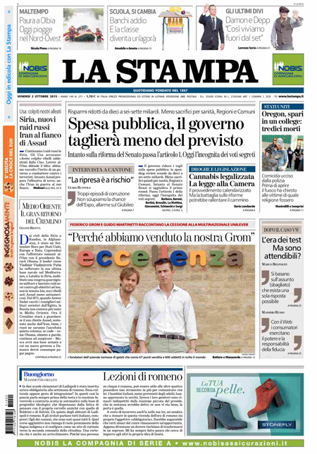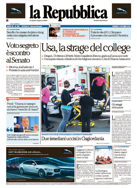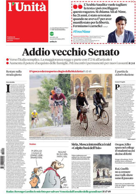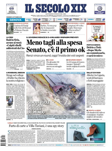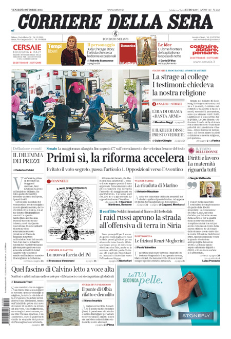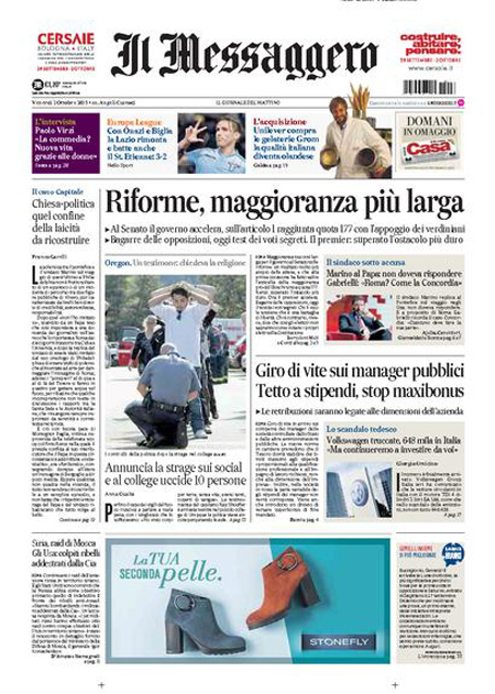 ROMA – I giornali di oggi, 2 ottobre, dividono l’apertura fra le notizie sulla strage in un college in Oregon, dove un uomo ha sparato uccidendo 13 persone ed è stato poi ucciso dalla polizia, e il voto favorevole del Senato sul primo articolo della riforma istituzionale che modifica le funzioni e le modalità di elezione del Senato, con l’attesa per il voto sull’articolo 2 che dovrebbe essere votato a scrutinio segreto.