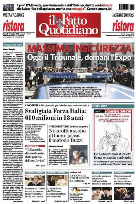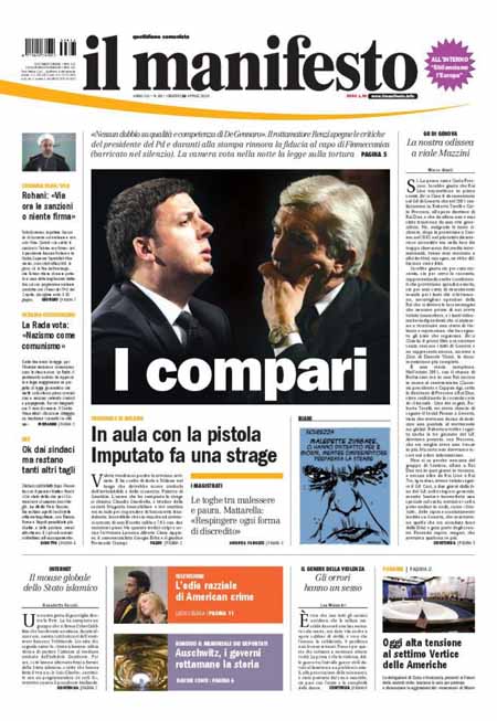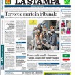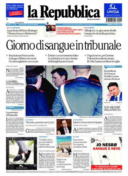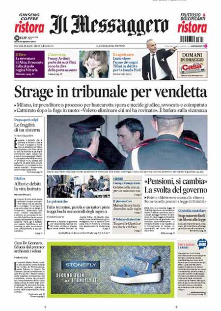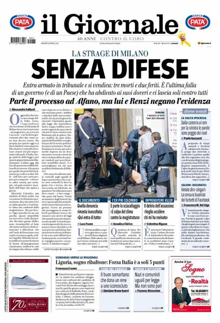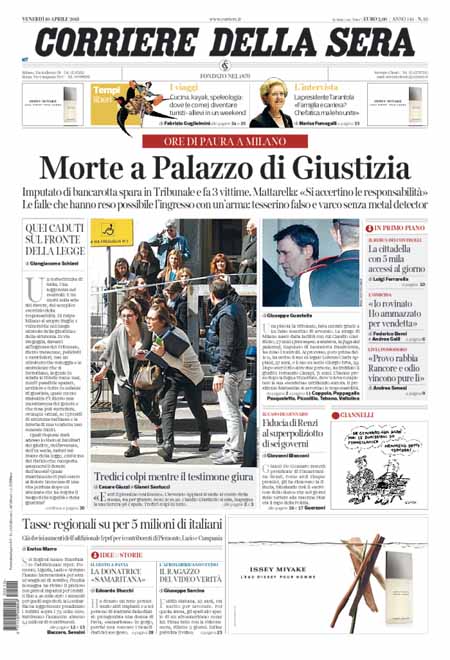 ROMA – Tutte le prime pagine di oggi, venerdì 10 aprile, aprono con un grande titolo su quello che è successo ieri nel Tribunale di Milano, dove Claudio Giardiello ha ucciso tre persone prima di scappare ed essere poi arrestato dalla polizia. Fa eccezione il Manifesto che apre con la difesa di Gianni De Gennaro da parte di Matteo Renzi.