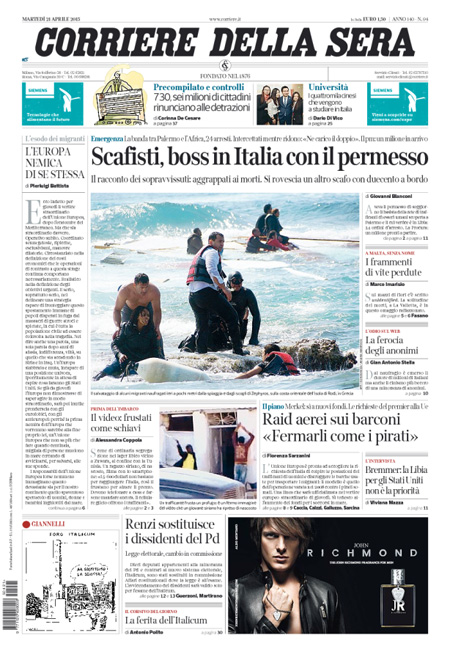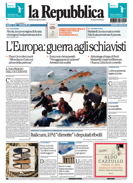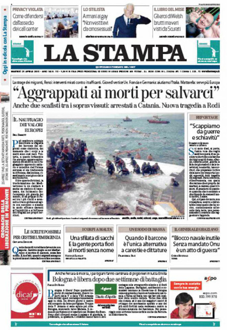 ROMA – Le prime pagine dei giornali di martedì 21 aprile. La Stampa: “Il racconto dei sopravvissuti: aggrappati ai morti per salvarci”. Il Corriere della Sera: “Scafisti, boss in Italia con il permesso”. La Repubblica: “L’Europa: guerra agli schiavisti”.